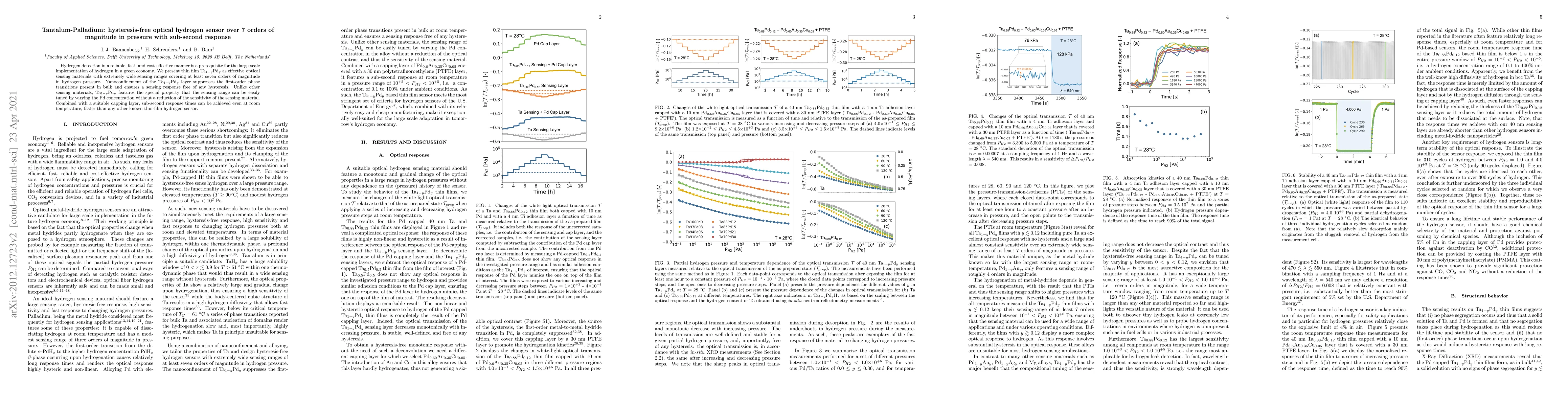 This paper introduces thin film Ta$_{1-y}$Pd$_y$ as a highly effective optical hydrogen sensor capable of detecting hydrogen over seven orders of magnitude in pressure with sub-second response times. The material's nanoconfinement eliminates hysteresis and allows for tunable sensing range without compromising sensitivity.