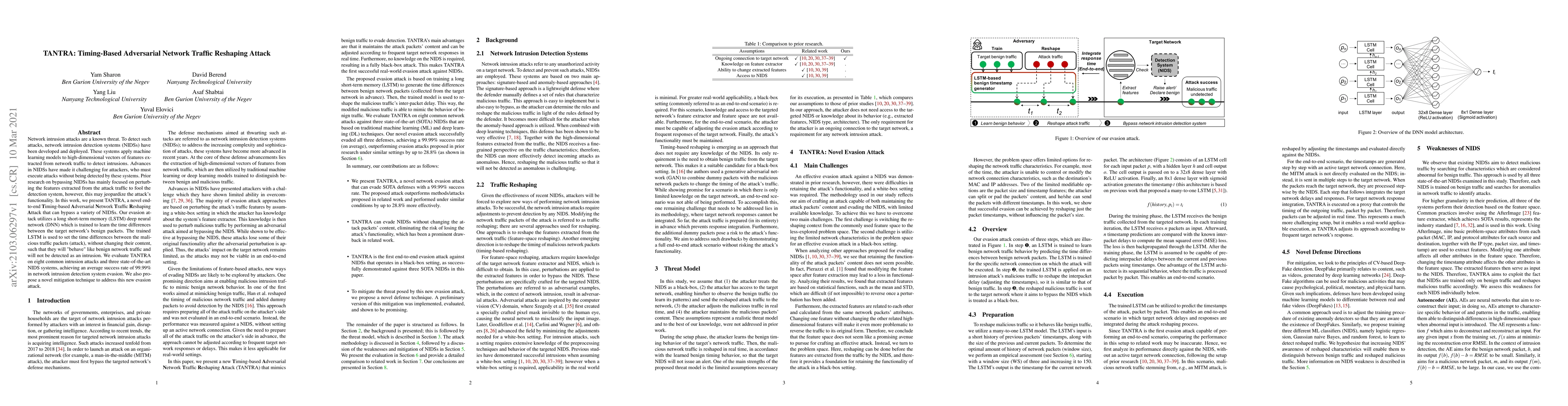 TANTRA is a Timing-based Adversarial Network Traffic Reshaping Attack that uses an LSTM DNN to reshape attack packets' timing to mimic benign traffic, evading detection by NIDSs with an average success rate of 99.99%. A new mitigation technique is also proposed to counter this evasion method.