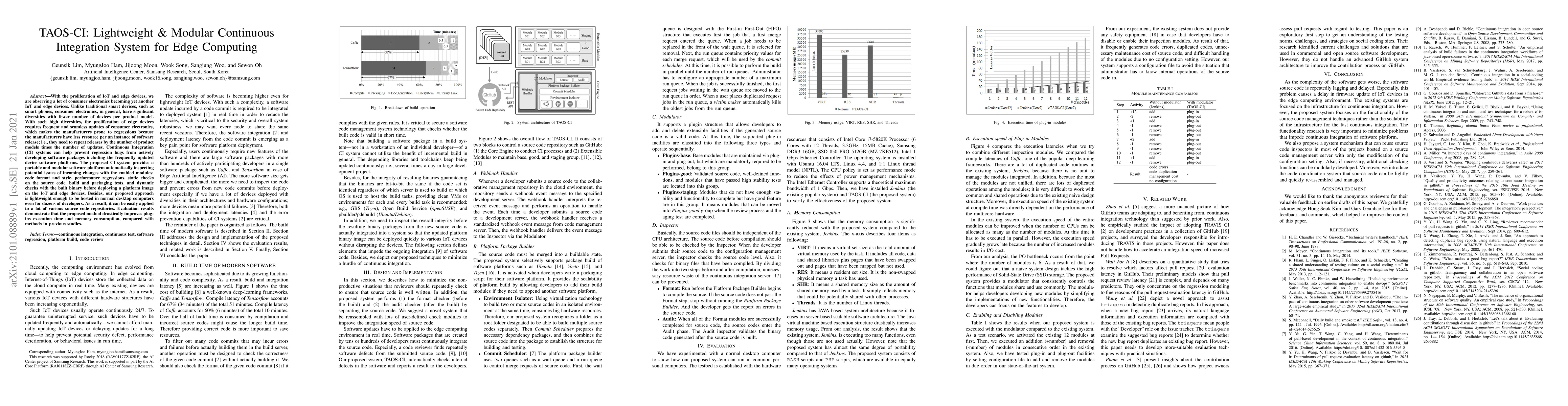 This paper introduces TAOS-CI, a lightweight and modular continuous integration system for edge computing that improves plug-in execution time and memory consumption, enabling frequent updates of consumer electronics.