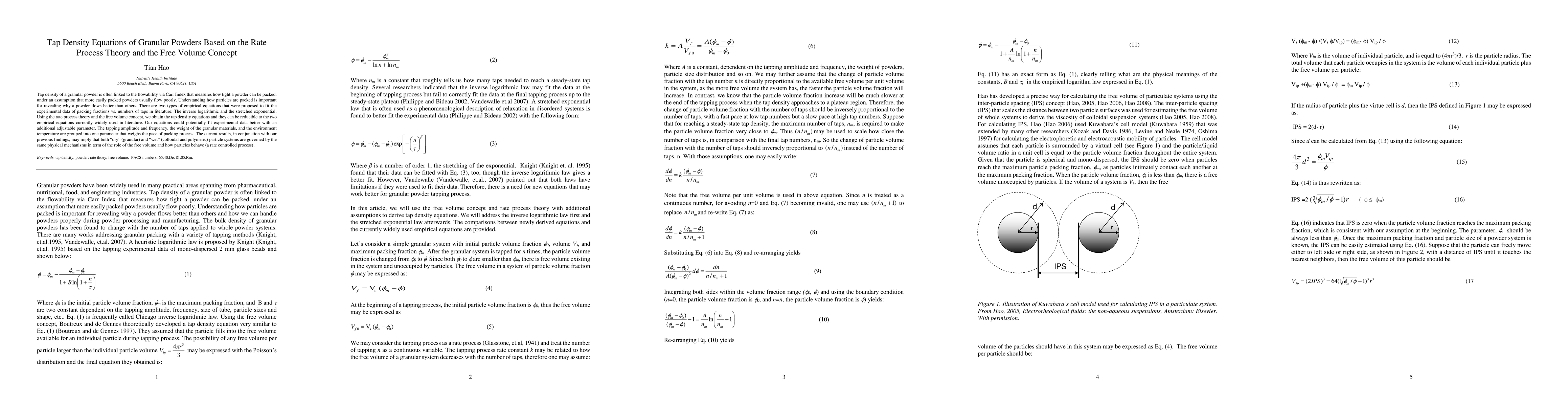 Tap density of a granular powder is often linked to the flowability via Carr Index that measures how tight a powder can be packed, under an assumption that more easily packed powders usually flow poorly. Understanding how particles are packed is important for revealing why a powder flows better than others. There are two types of empirical equations that were proposed to fit the experimental data of packing fractions vs. numbers of taps in literature: The inverse logarithmic and the stretched exponential. Using the rate process theory and the free volume concept, we obtain the tap density equations and they can be reducible to the two empirical equations currently widely used in literature. Our equations could potentially fit experimental data better with an additional adjustable parameter. The tapping amplitude and frequency, the weight of the granular materials, and the environment temperature are grouped into one parameter that weighs the pace of packing process. The current results, in conjunction with our previous findings, may imply that both dry(granular)and wet(colloidal and polymeric) particle systems are governed by the same physical mechanisms in term of the role of the free volume and how particles behave (a rate controlled process).