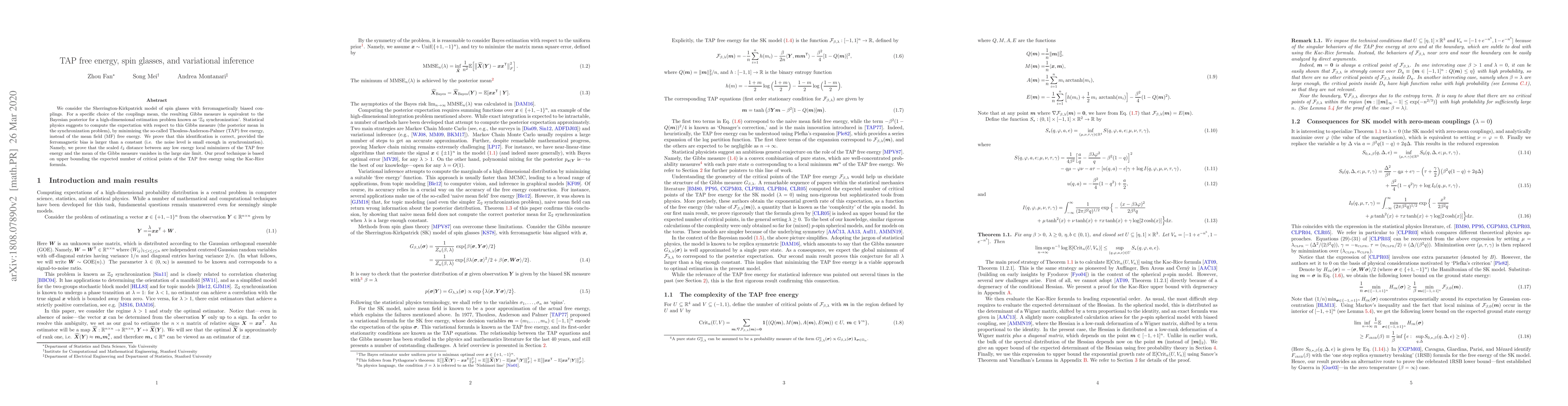 We consider the Sherrington-Kirkpatrick model of spin glasses with ferromagnetically biased couplings. For a specific choice of the couplings mean, the resulting Gibbs measure is equivalent to the Bayesian posterior for a high-dimensional estimation problem known as `$Z_2$ synchronization'. Statistical physics suggests to compute the expectation with respect to this Gibbs measure (the posterior mean in the synchronization problem), by minimizing the so-called Thouless-Anderson-Palmer (TAP) free energy, instead of the mean field (MF) free energy. We prove that this identification is correct, provided the ferromagnetic bias is larger than a constant (i.e. the noise level is small enough in synchronization). Namely, we prove that the scaled $\ell_2$ distance between any low energy local minimizers of the TAP free energy and the mean of the Gibbs measure vanishes in the large size limit. Our proof technique is based on upper bounding the expected number of critical points of the TAP free energy using the Kac-Rice formula.