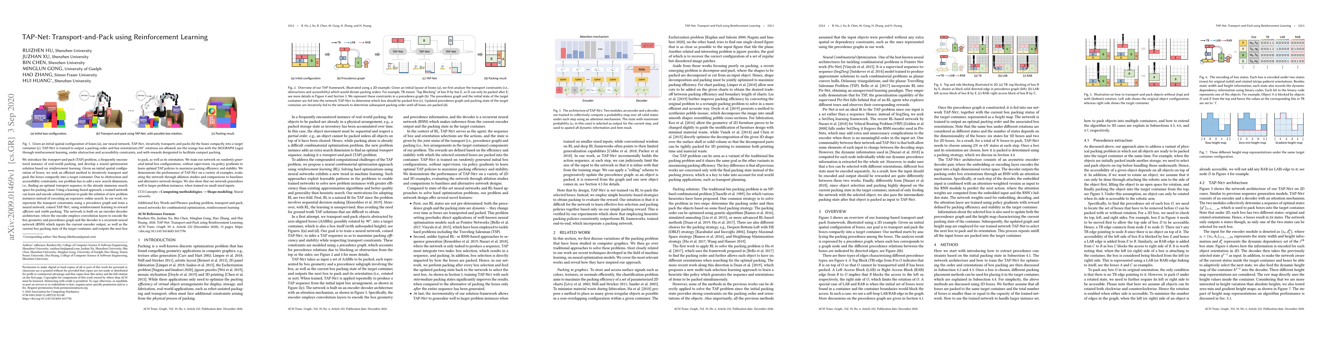 The paper introduces TAP-Net, a reinforcement learning-based solution for the transport-and-pack (TAP) problem, a complex real-world packing challenge. TAP-Net, an encoder-decoder neural network, optimizes box transport and packing sequences into a target container, considering geometric constraints and accessibility. Trained via policy gradients on random box configurations, TAP-Net outperforms baselines and alternative designs, demonstrating efficiency, stability, and generalization to larger problem instances.