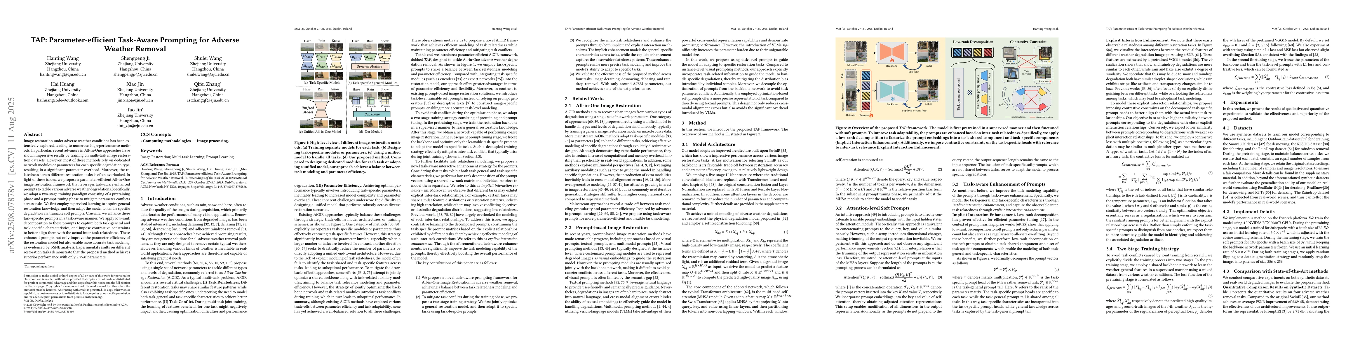 Image restoration under adverse weather conditions has been extensively explored, leading to numerous high-performance methods. In particular, recent advances in All-in-One approaches have shown impressive results by training on multi-task image restoration datasets. However, most of these methods rely on dedicated network modules or parameters for each specific degradation type, resulting in a significant parameter overhead. Moreover, the relatedness across different restoration tasks is often overlooked. In light of these issues, we propose a parameter-efficient All-in-One image restoration framework that leverages task-aware enhanced prompts to tackle various adverse weather degradations.Specifically, we adopt a two-stage training paradigm consisting of a pretraining phase and a prompt-tuning phase to mitigate parameter conflicts across tasks. We first employ supervised learning to acquire general restoration knowledge, and then adapt the model to handle specific degradation via trainable soft prompts. Crucially, we enhance these task-specific prompts in a task-aware manner. We apply low-rank decomposition to these prompts to capture both task-general and task-specific characteristics, and impose contrastive constraints to better align them with the actual inter-task relatedness. These enhanced prompts not only improve the parameter efficiency of the restoration model but also enable more accurate task modeling, as evidenced by t-SNE analysis. Experimental results on different restoration tasks demonstrate that the proposed method achieves superior performance with only 2.75M parameters.