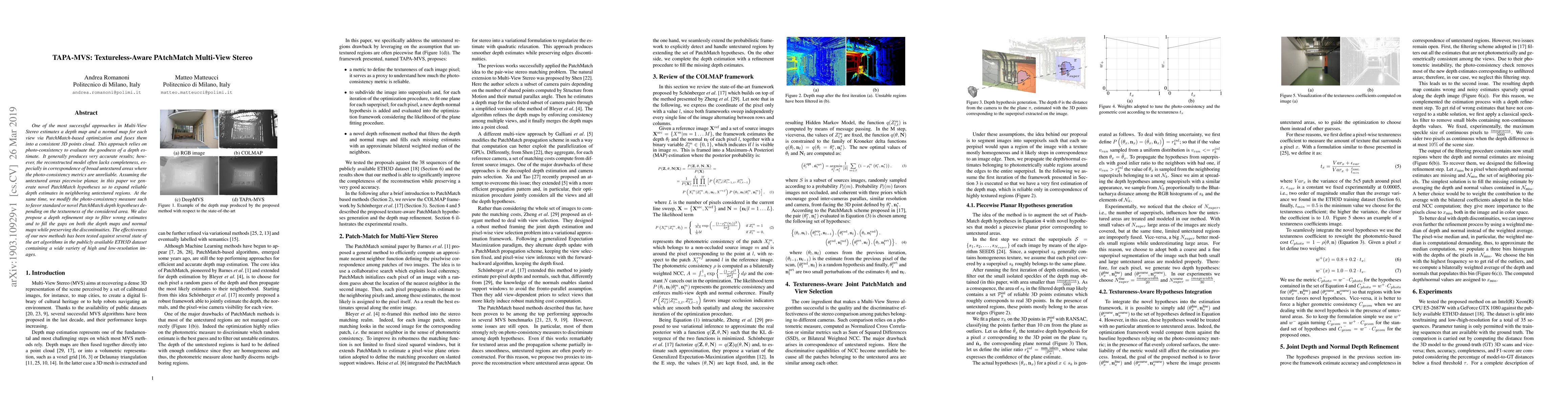 TAPA-MVS introduces a method to enhance Multi-View Stereo reconstruction by generating PatchMatch hypotheses for untextured areas and refining depth estimates to improve completeness, especially in broad untextured regions, while maintaining accuracy against state-of-the-art algorithms.