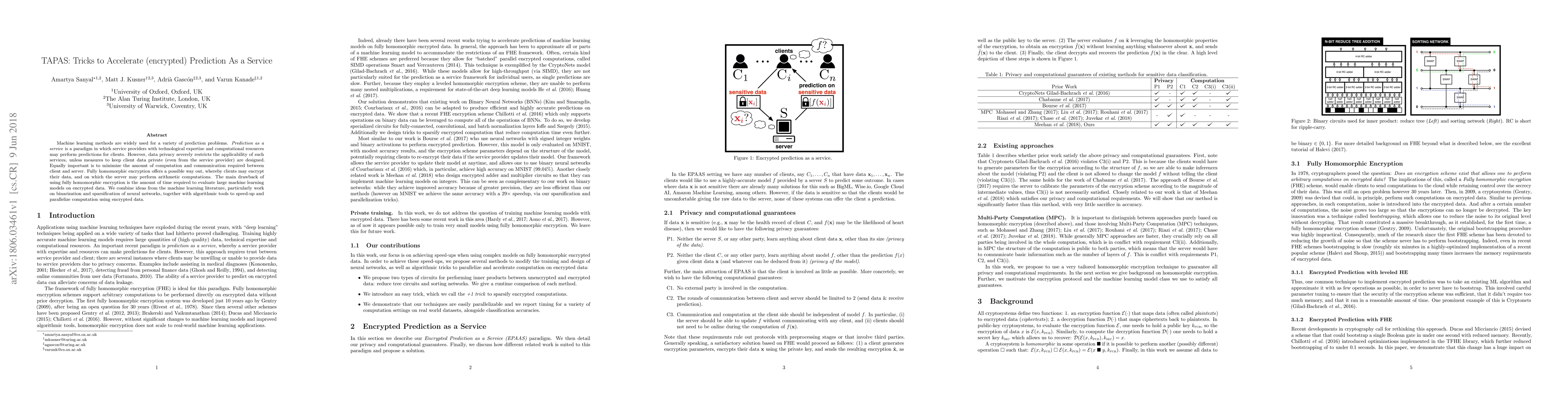 TAPAS introduces techniques to accelerate encrypted machine learning predictions as a service by leveraging binarization, sparsification, and parallel computation, addressing the computational and privacy challenges of fully homomorphic encryption.