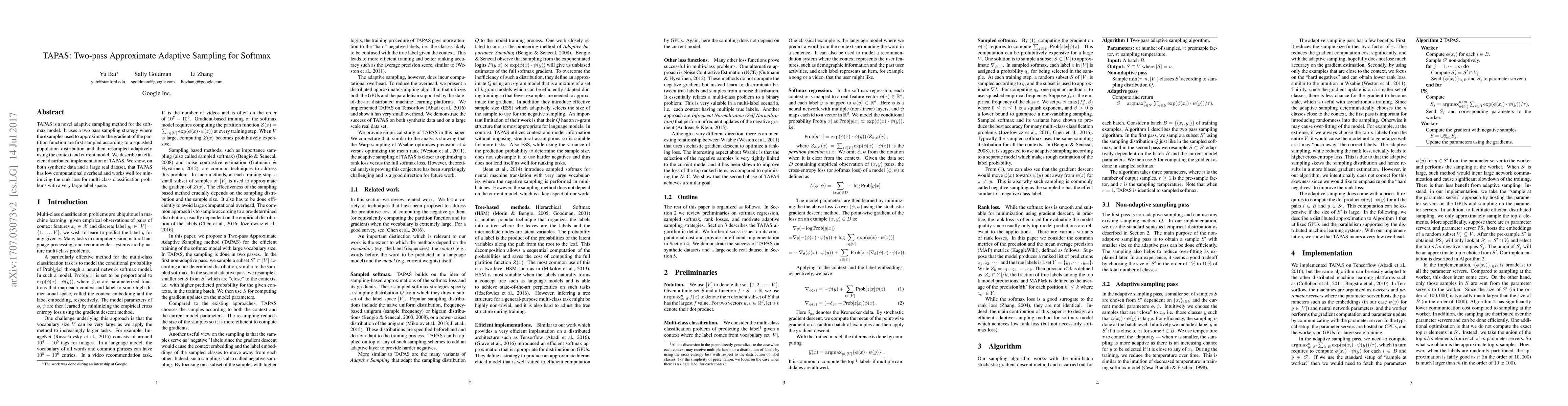 TAPAS is a novel adaptive sampling method for the softmax model. It uses a two pass sampling strategy where the examples used to approximate the gradient of the partition function are first sampled according to a squashed population distribution and then resampled adaptively using the context and current model. We describe an efficient distributed implementation of TAPAS. We show, on both synthetic data and a large real dataset, that TAPAS has low computational overhead and works well for minimizing the rank loss for multi-class classification problems with a very large label space.