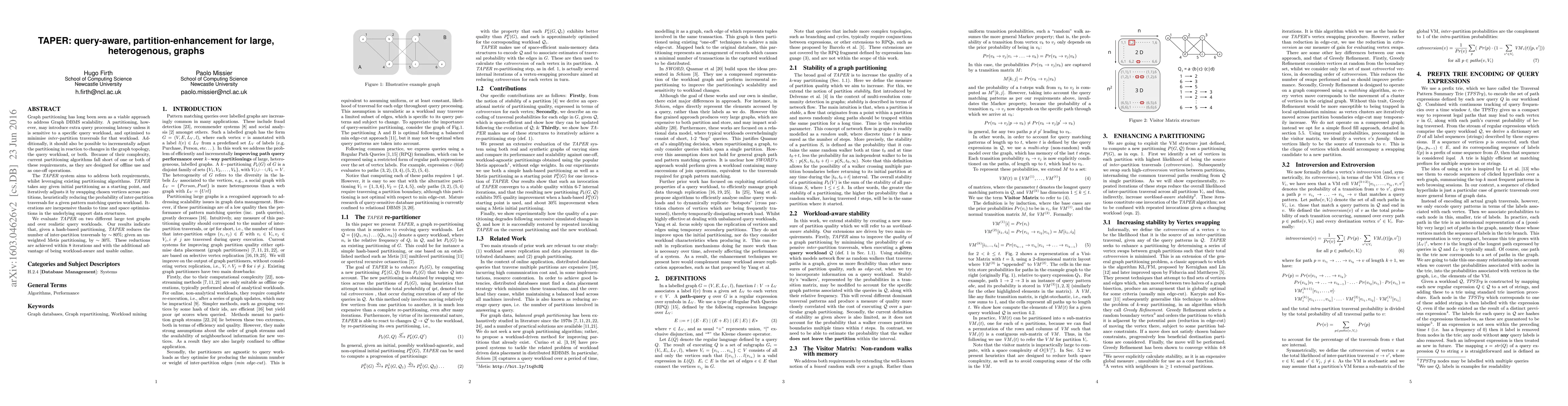 TAPER introduces a novel query-aware, partition-enhancement system that iteratively adjusts graph partitioning to minimize inter-partition traversals for a given query workload, using existing partitioning algorithms and optimized support data structures.