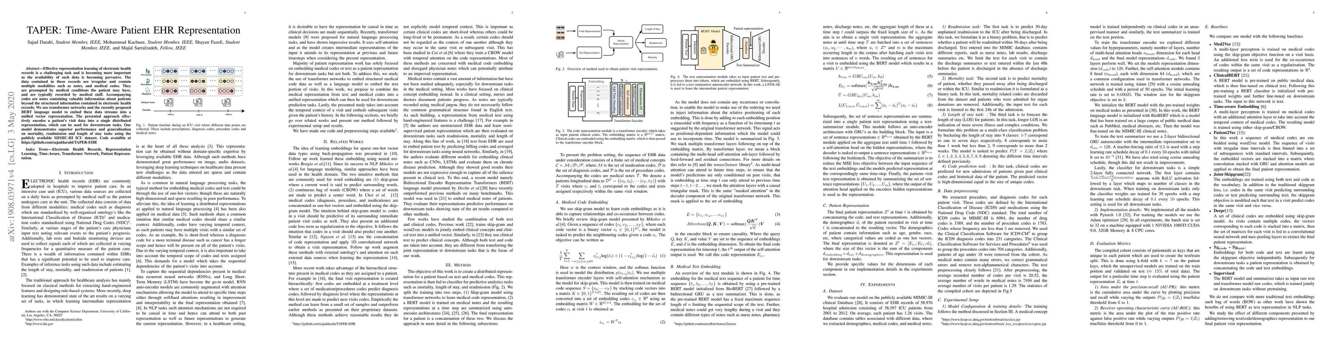 Effective representation learning of electronic health records is a challenging task and is becoming more important as the availability of such data is becoming pervasive. The data contained in these records are irregular and contain multiple modalities such as notes, and medical codes. They are preempted by medical conditions the patient may have, and are typically jotted down by medical staff. Accompanying codes are notes containing valuable information about patients beyond the structured information contained in electronic health records. We use transformer networks and the recently proposed BERT language model to embed these data streams into a unified vector representation. The presented approach effectively encodes a patient's visit data into a single distributed representation, which can be used for downstream tasks. Our model demonstrates superior performance and generalization on mortality, readmission and length of stay tasks using the publicly available MIMIC-III ICU dataset. Code avaialble at https://github.com/sajaddarabi/TAPER-EHR