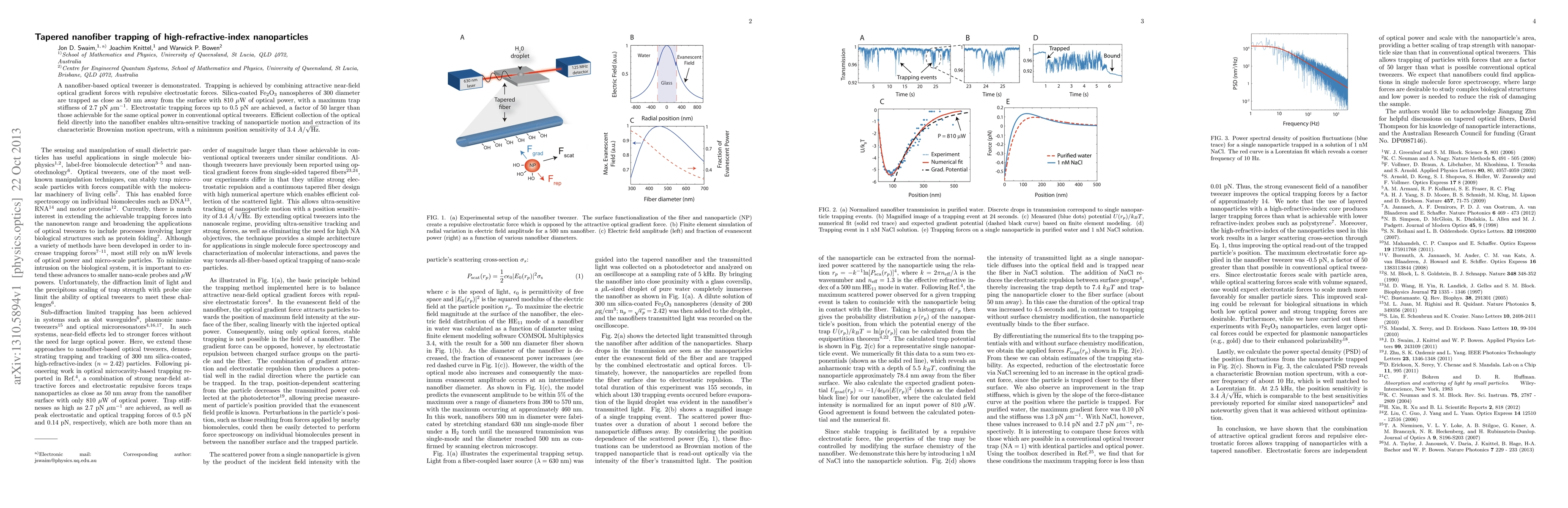 This paper demonstrates a nanofiber-based optical tweezer that combines optical gradient forces and electrostatic forces to trap high-refractive-index nanoparticles, achieving a maximum trap stiffness significantly higher than conventional optical tweezers. The method enables ultra-sensitive tracking of nanoparticle motion with a minimum position sensitivity of 3.4 Å/√Hz.