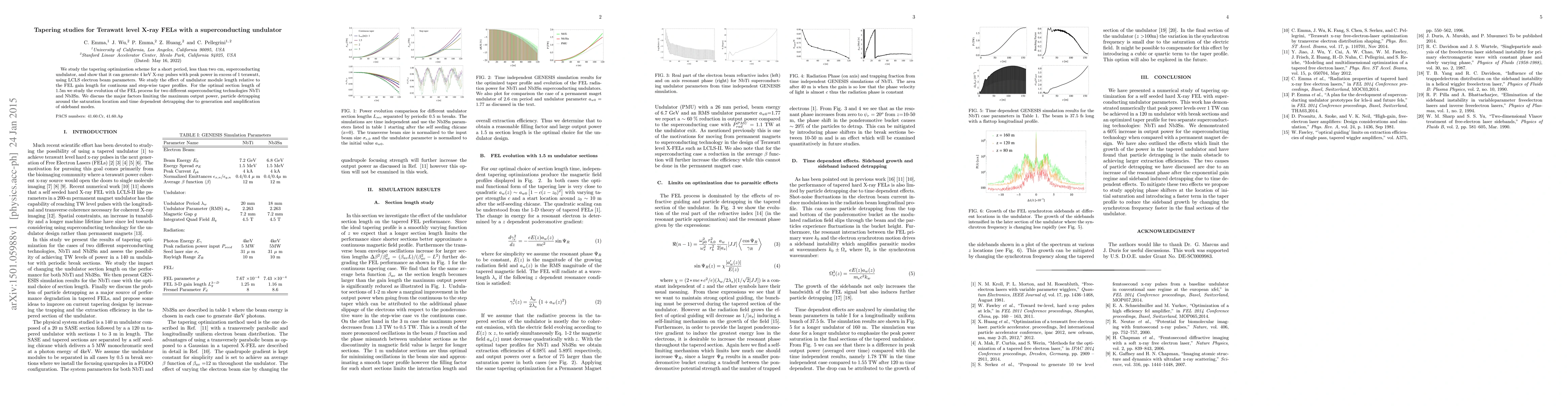 We study the tapering optimization scheme for a short period, less than two cm, superconducting undulator, and show that it can generate 4 keV X-ray pulses with peak power in excess of 1 terawatt, using LCLS electron beam parameters. We study the effect of undulator module length relative to the FEL gain length for continous and step-wise taper profiles. For the optimal section length of 1.5m we study the evolution of the FEL process for two different superconducting technologies NbTi and Nb3Sn. We discuss the major factors limiting the maximum output power, particle detrapping around the saturation location and time dependent detrapping due to generation and amplification of sideband modes.