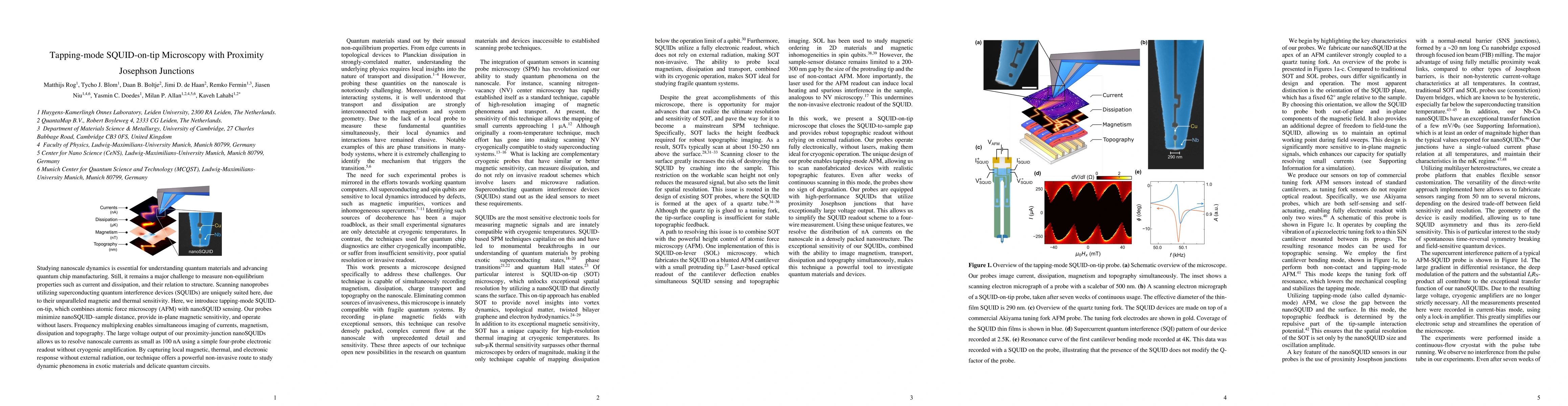 Studying nanoscale dynamics is essential for understanding quantum materials and advancing quantum chip manufacturing. Still, it remains a major challenge to measure non-equilibrium properties such as current and dissipation, and their relation to structure. Scanning nanoprobes utilizing superconducting quantum interference devices (SQUIDs) are uniquely suited here, due to their unparalleled magnetic and thermal sensitivity. Here, we introduce tapping-mode SQUID-on-tip, which combines atomic force microscopy (AFM) with nanoSQUID sensing. Our probes minimize nanoSQUID-sample distance, provide in-plane magnetic sensitivity, and operate without lasers. Frequency multiplexing enables simultaneous imaging of currents, magnetism, dissipation and topography. The large voltage output of our proximity-junction nanoSQUIDs allows us to resolve nanoscale currents as small as 100 nA using a simple four-probe electronic readout without cryogenic amplification. By capturing local magnetic, thermal, and electronic response without external radiation, our technique offers a powerful non-invasive route to study dynamic phenomena in exotic materials and delicate quantum circuits.