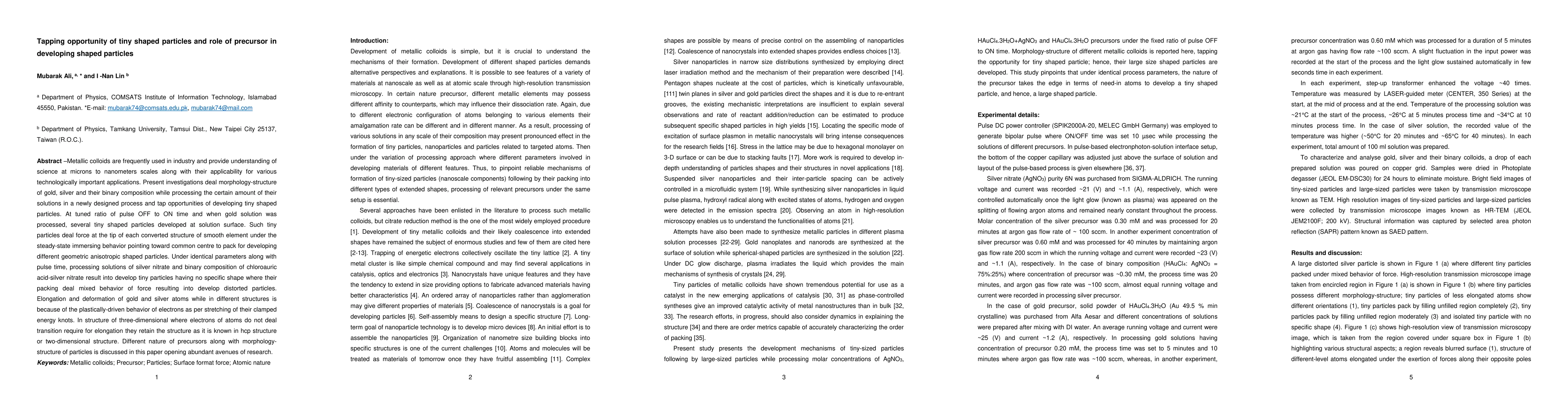 Metallic colloids are frequently used in industry and provide understanding of science at microns to nanometers scales along with their applicability for various technologically important applications. Present investigations deal morphology-structure of gold, silver and their binary composition while processing the certain amount of their solutions in a newly designed process and tap opportunities of developing tiny shaped particles. At tuned ratio of pulse OFF to ON time and when gold solution was processed, several tiny shaped particles developed at solution surface. Such tiny particles deal force at the tip of each converted structure of smooth element under the steady-state immersing behavior pointing toward common centre to pack for developing different geometric anisotropic shaped particles. Under identical parameters along with pulse time, processing solutions of silver nitrate and binary composition of chloroauric acid-silver nitrate result into develop tiny particles having no specific shape where their packing deal mixed behavior of force resulting into develop distorted particles. Elongation and deformation of gold and silver atoms while in different structures is because of the plastically-driven behavior of electrons as per stretching of their clamped energy knots. In structure of three-dimensional where electrons of atoms do not deal transition require for elongation they retain the structure as it is known in hcp structure or two-dimensional structure. Different nature of precursors along with morphology-structure of particles is discussed in this paper opening abundant avenues of research.