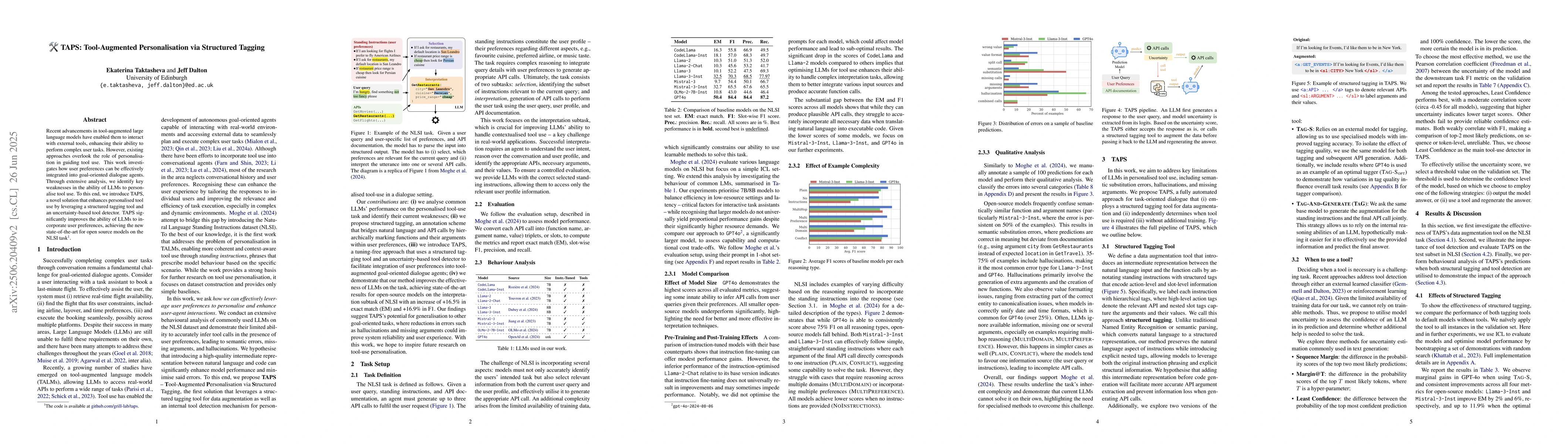 Recent advancements in tool-augmented large language models have enabled them to interact with external tools, enhancing their ability to perform complex user tasks. However, existing approaches overlook the role of personalisation in guiding tool use. This work investigates how user preferences can be effectively integrated into goal-oriented dialogue agents. Through extensive analysis, we identify key weaknesses in the ability of LLMs to personalise tool use. To this end, we introduce TAPS, a novel solution that enhances personalised tool use by leveraging a structured tagging tool and an uncertainty-based tool detector. TAPS significantly improves the ability of LLMs to incorporate user preferences, achieving the new state-of-the-art for open source models on the NLSI task.