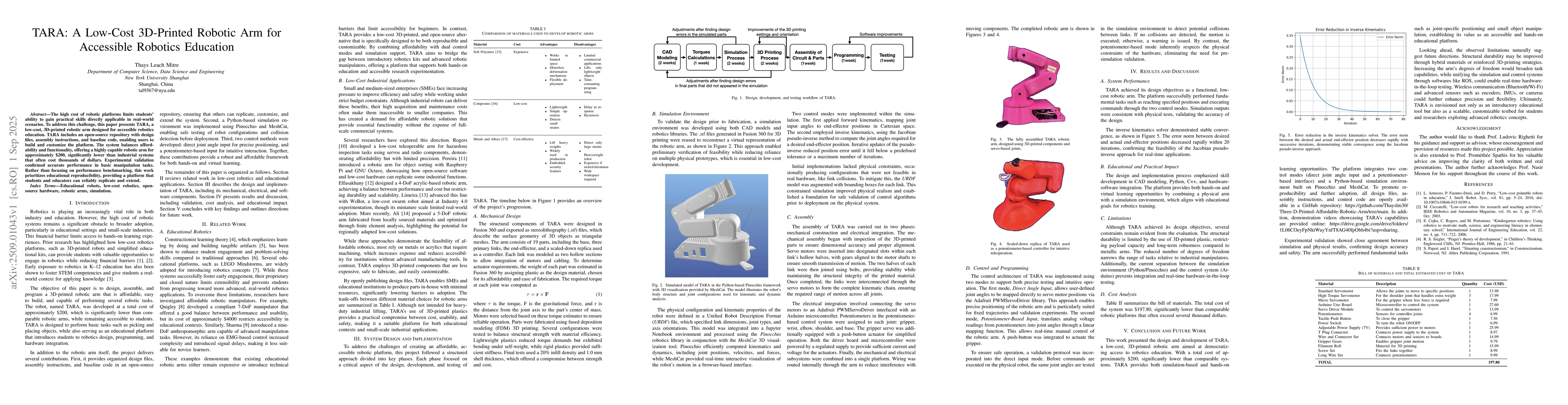 The high cost of robotic platforms limits students' ability to gain practical skills directly applicable in real-world scenarios. To address this challenge, this paper presents TARA, a low-cost, 3D-printed robotic arm designed for accessible robotics education. TARA includes an open-source repository with design files, assembly instructions, and baseline code, enabling users to build and customize the platform. The system balances affordability and functionality, offering a highly capable robotic arm for approximately 200 USD, significantly lower than industrial systems that often cost thousands of dollars. Experimental validation confirmed accurate performance in basic manipulation tasks. Rather than focusing on performance benchmarking, this work prioritizes educational reproducibility, providing a platform that students and educators can reliably replicate and extend.