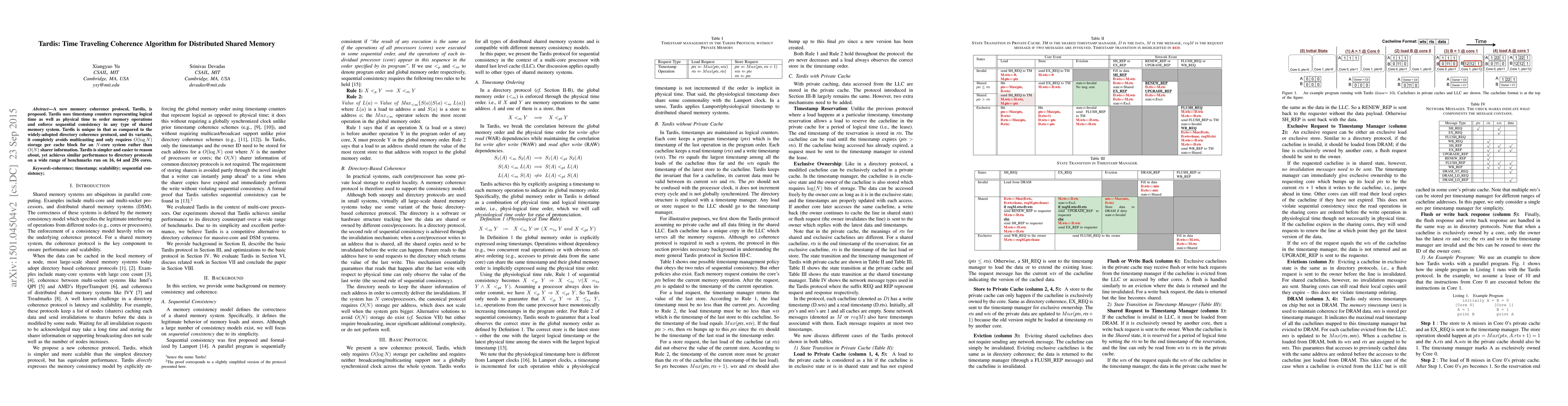 A new memory coherence protocol, Tardis, is proposed. Tardis uses timestamp counters representing logical time as well as physical time to order memory operations and enforce sequential consistency in any type of shared memory system. Tardis is unique in that as compared to the widely-adopted directory coherence protocol, and its variants, it completely avoids multicasting and only requires O(log N) storage per cache block for an N-core system rather than O(N) sharer information. Tardis is simpler and easier to reason about, yet achieves similar performance to directory protocols on a wide range of benchmarks run on 16, 64 and 256 cores.