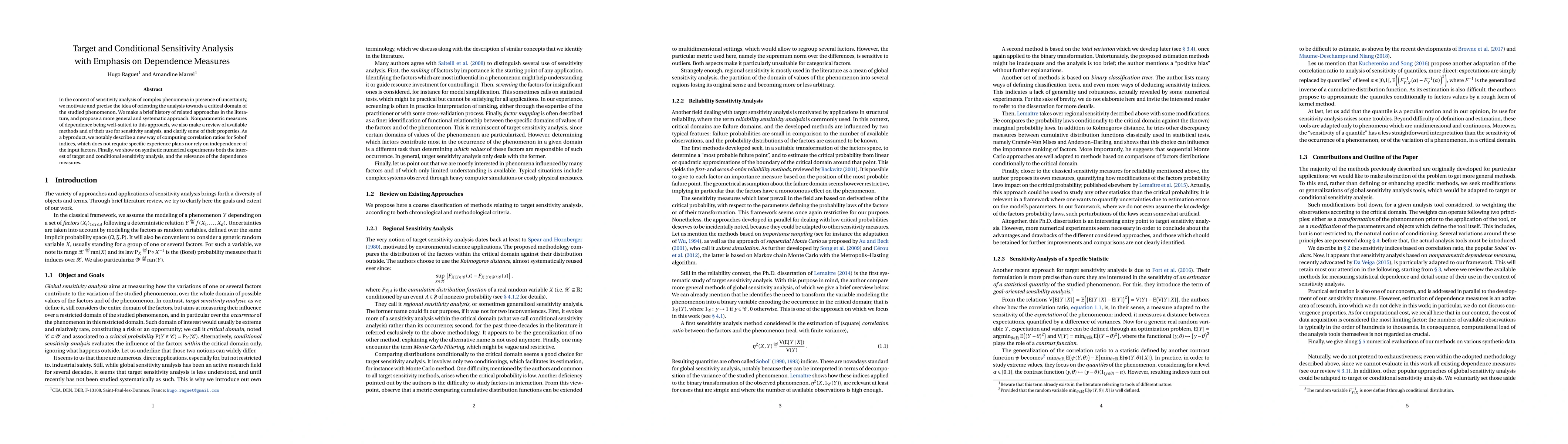 This paper proposes a systematic approach for target and conditional sensitivity analysis focusing on critical domains of complex phenomena under uncertainty. It reviews nonparametric dependence measures and introduces a new method for computing correlation ratios for Sobol' indices, demonstrating its effectiveness through synthetic experiments.