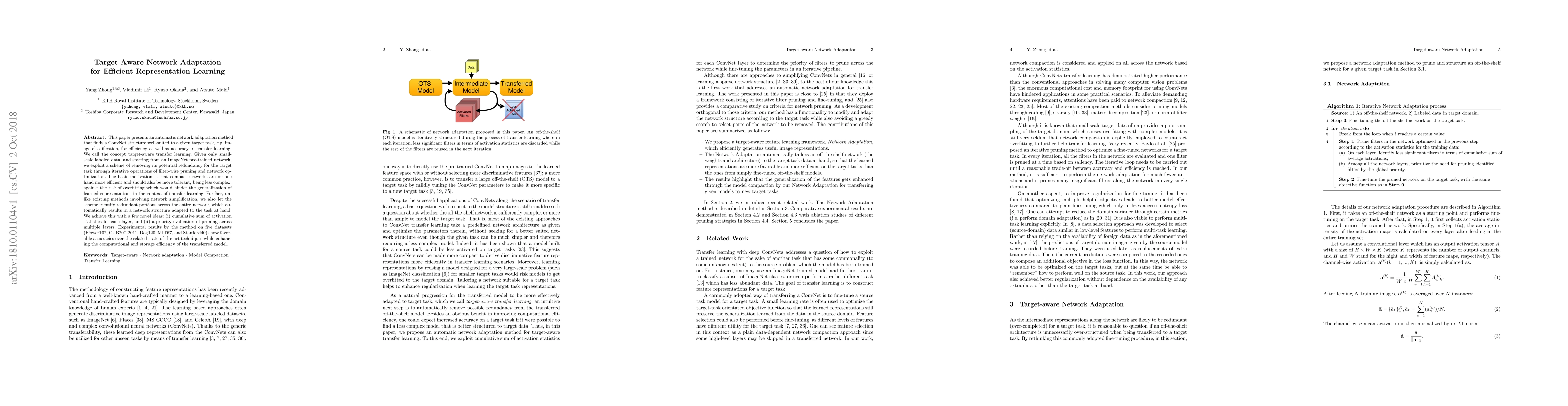 This paper introduces a method for efficient representation learning in transfer learning, which adapts a pre-trained network to a target task through iterative pruning and optimization, achieving favorable accuracy and efficiency gains over state-of-the-art techniques.