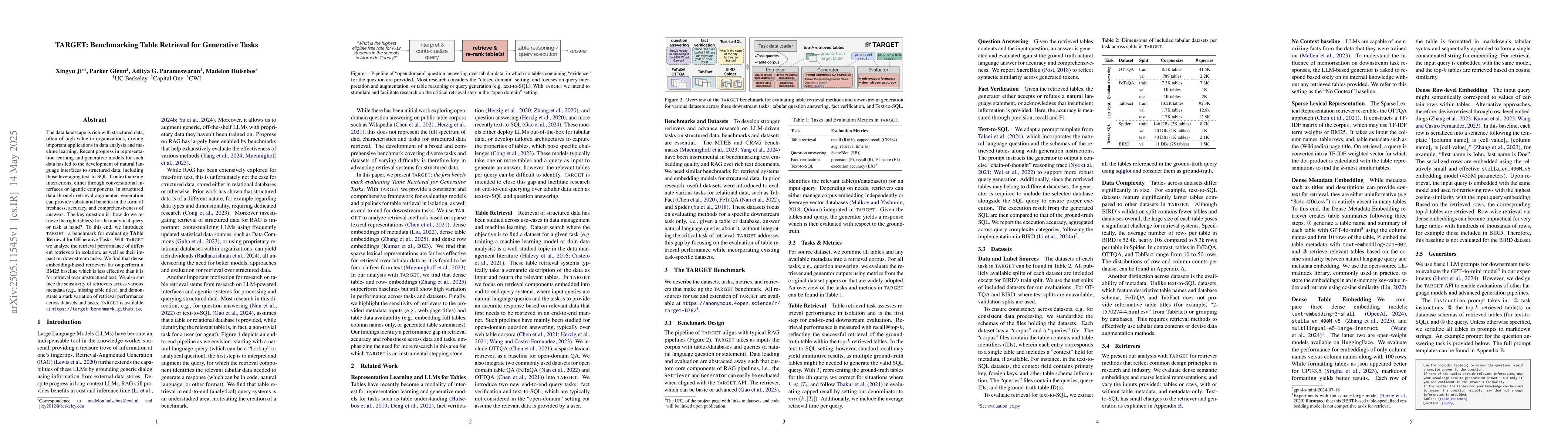 TARGET benchmark for evaluating table retrieval methods in generative tasks.