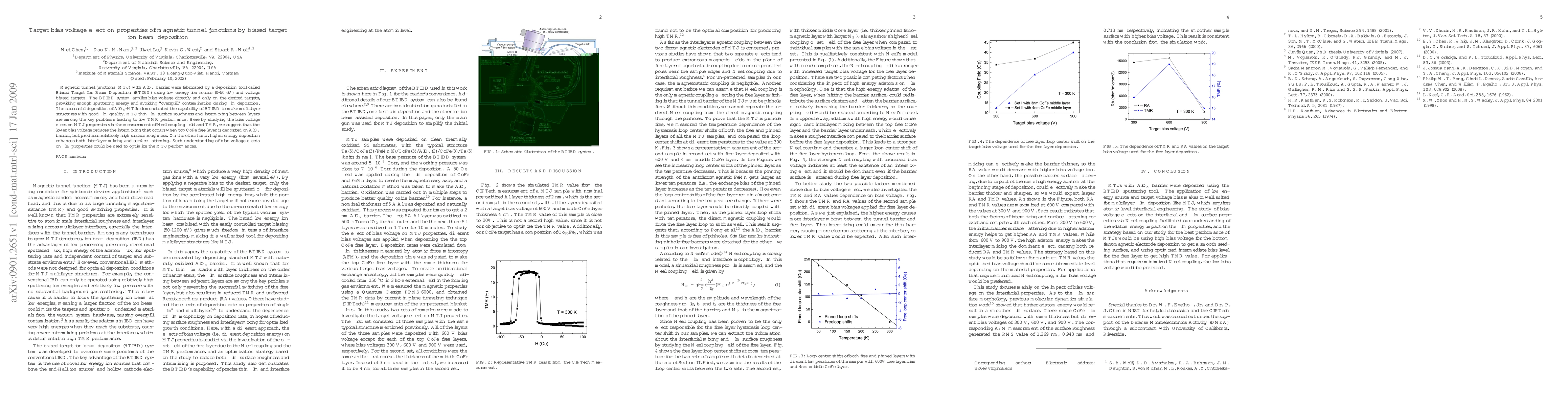 Magnetic tunnel junctions (MTJ) with AlOx barrier were fabricated by a deposition tool called Biased Target Ion Beam Deposition (BTIBD) using low energy ion source (0-50 eV) and voltage biased targets. The BTIBD system applies bias voltage directly and only on the desired targets, providing enough sputtering energy and avoiding "overspill" contamination during film deposition. The successful deposition of AlOx-MTJs demonstrated the capability of BTIBD to make multilayer structures with good film quality. MTJ thin film surface roughness and intermixing between layers are among the key problems leading to low TMR performance. Here by studying the bias voltage effect on MTJ properties via the measurement of Neel coupling field and TMR, we suggest that the lower bias voltage reduces the intermixing that occurs when top CoFe free layer is deposited on AlOx barrier, but produces relatively high surface roughness. On the other hand, higher energy deposition enhances both interlayer mixing and surface flattening. Such understanding of bias voltage effects on film properties could be used to optimize the MTJ performances.