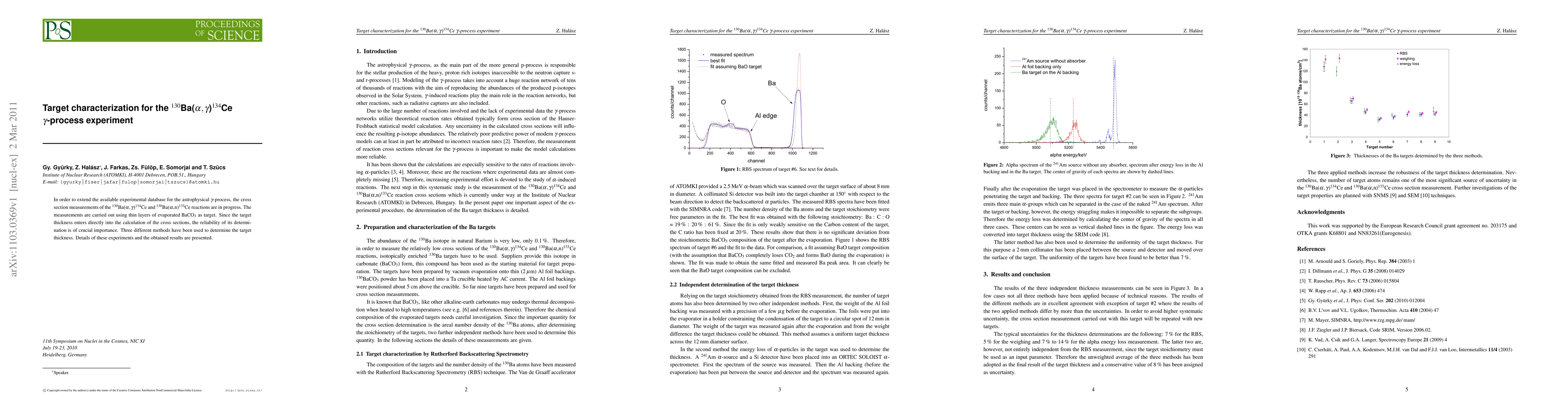 This paper details the progress of measuring cross sections for the 130Ba(alpha,gamma)134Ce and 130Ba(alpha,n)133Ce reactions using evaporated BaCO3 targets. Three methods were employed to determine target thickness, crucial for accurate cross-section calculations, with results and experimental details presented.