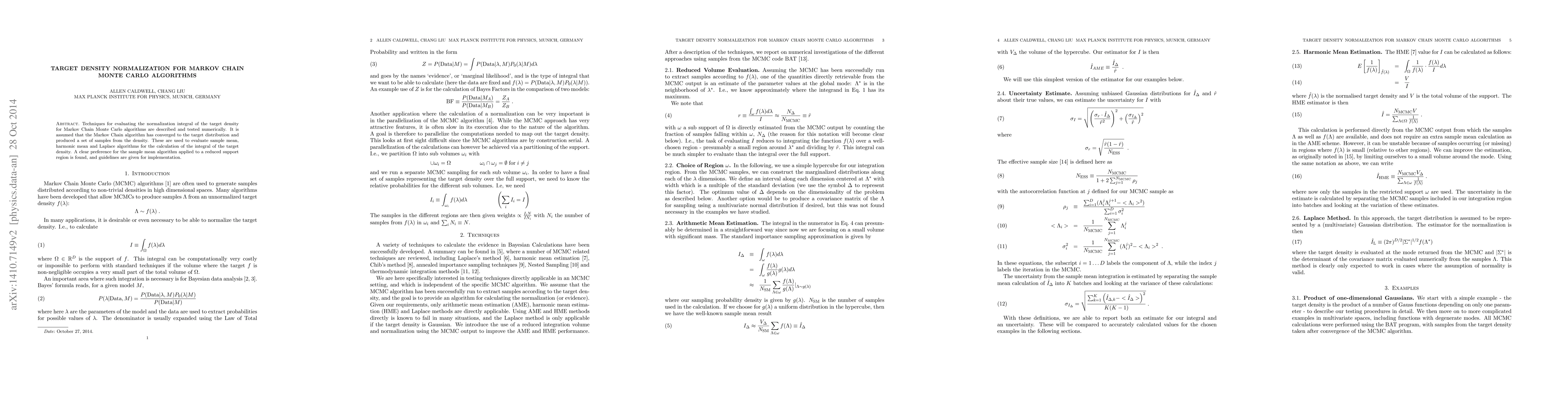 Techniques for evaluating the normalization integral of the target density for Markov Chain Monte Carlo algorithms are described and tested numerically. It is assumed that the Markov Chain algorithm has converged to the target distribution and produced a set of samples from the density. These are used to evaluate sample mean, harmonic mean and Laplace algorithms for the calculation of the integral of the target density. A clear preference for the sample mean algorithm applied to a reduced support region is found, and guidelines are given for implementation.