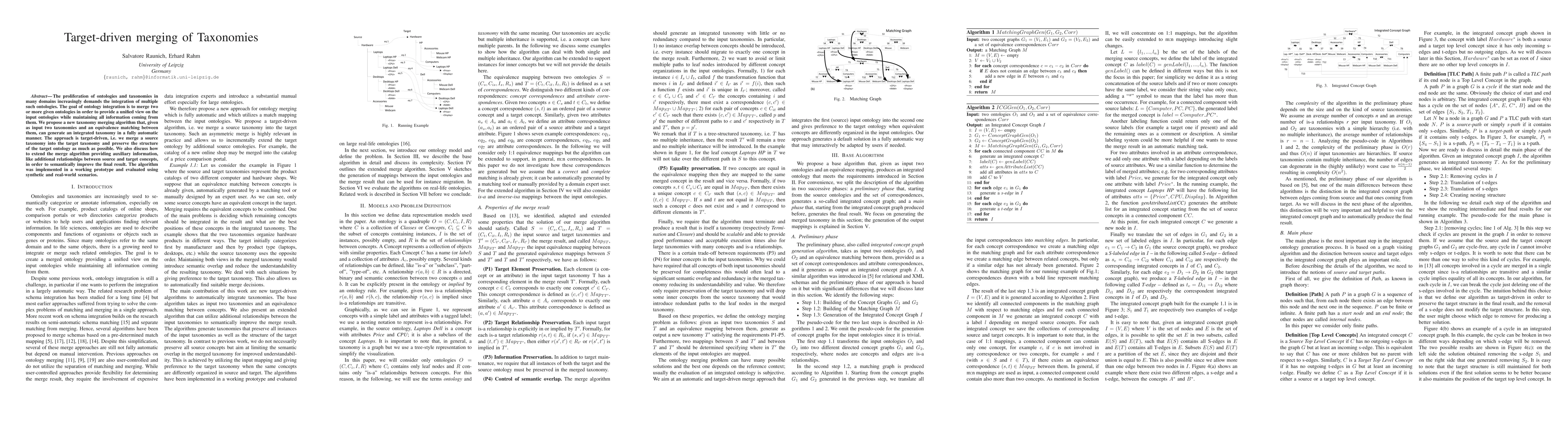 This paper proposes a target-driven algorithm for merging taxonomies, aiming to integrate multiple ontologies while preserving the target taxonomy's structure. The algorithm was implemented and evaluated to ensure the automatic generation of an integrated taxonomy with additional semantic improvements.