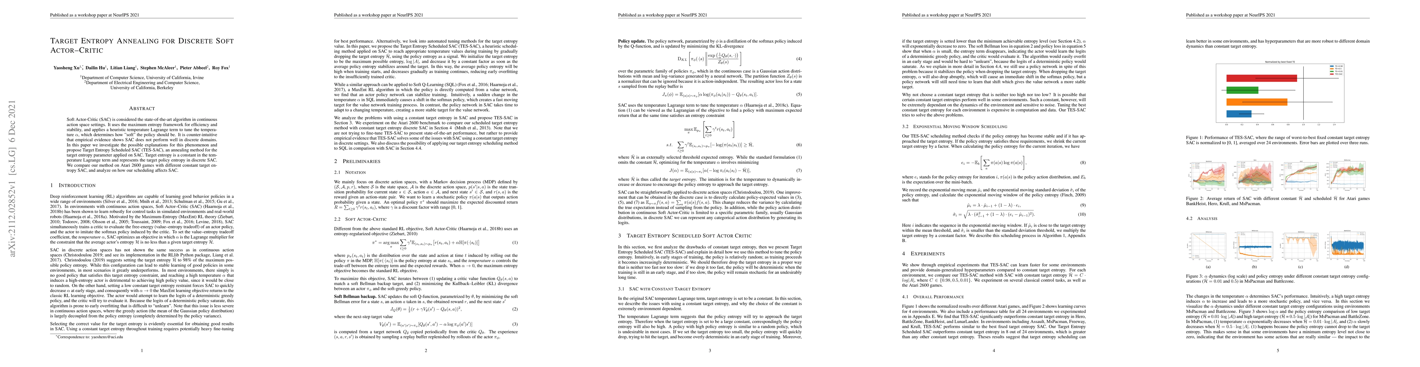 This paper proposes Target Entropy Scheduled SAC (TES-SAC) to improve the performance of Soft Actor-Critic (SAC) in discrete action spaces by annealing the target entropy parameter. The authors compare TES-SAC with constant target entropy SAC on Atari 2600 games to analyze the impact of entropy scheduling on performance.