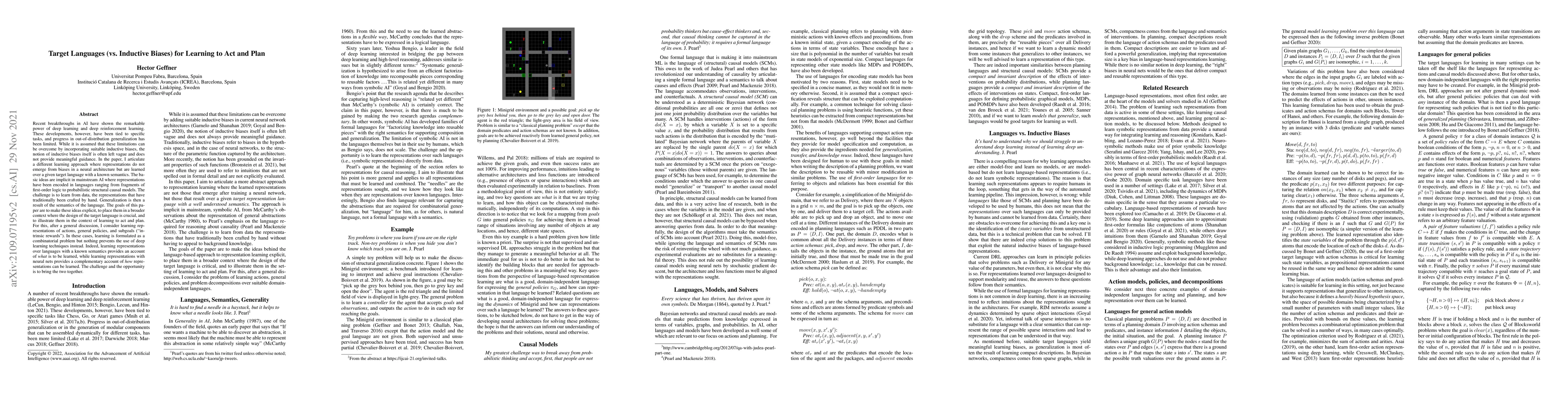 Recent breakthroughs in AI have shown the remarkable power of deep learning and deep reinforcement learning. These developments, however, have been tied to specific tasks, and progress in out-of-distribution generalization has been limited. While it is assumed that these limitations can be overcome by incorporating suitable inductive biases, the notion of inductive biases itself is often left vague and does not provide meaningful guidance. In the paper, I articulate a different learning approach where representations do not emerge from biases in a neural architecture but are learned over a given target language with a known semantics. The basic ideas are implicit in mainstream AI where representations have been encoded in languages ranging from fragments of first-order logic to probabilistic structural causal models. The challenge is to learn from data the representations that have traditionally been crafted by hand. Generalization is then a result of the semantics of the language. The goals of this paper are to make these ideas explicit, to place them in a broader context where the design of the target language is crucial, and to illustrate them in the context of learning to act and plan. For this, after a general discussion, I consider learning representations of actions, general policies, and subgoals ("intrinsic rewards"). In these cases, learning is formulated as a combinatorial problem but nothing prevents the use of deep learning techniques instead. Indeed, learning representations over languages with a known semantics provides an account of what is to be learned, while learning representations with neural nets provides a complementary account of how representations can be learned. The challenge and the opportunity is to bring the two together.