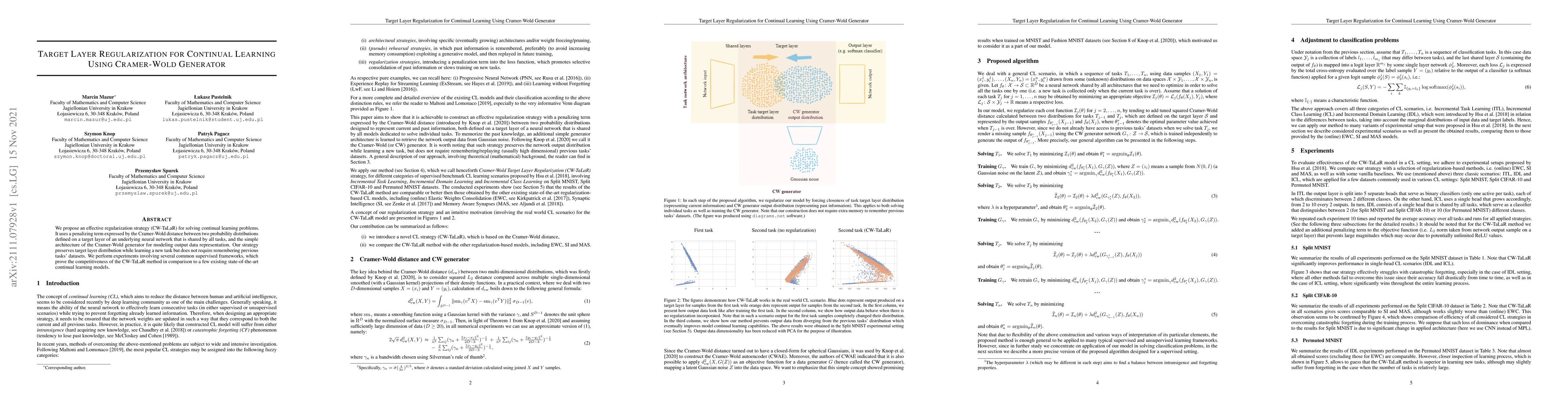 This paper proposes CW-TaLaR, a regularization strategy for continual learning that uses the Cramer-Wold distance to penalize changes in the target layer's distribution, enabling task-specific learning without requiring past datasets. Experiments show CW-TaLaR's competitiveness against state-of-the-art continual learning models.
