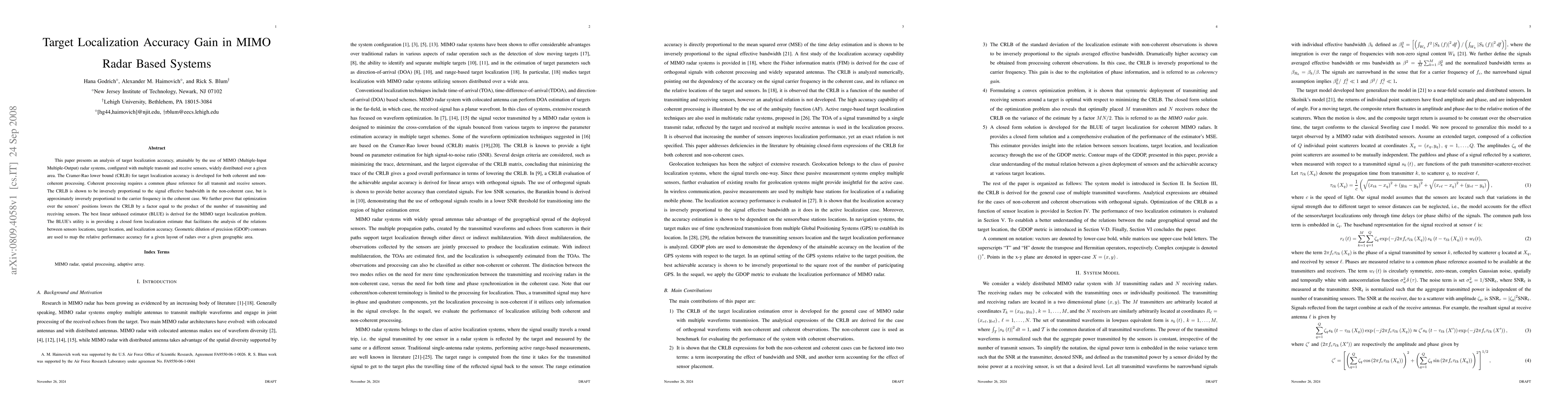 This paper analyzes target localization accuracy in MIMO radar systems, showing that optimization of sensor positions reduces the Cramer-Rao lower bound, and derives a best linear unbiased estimator to provide a closed-form localization estimate, using geometric dilution of precision contours to map performance accuracy.