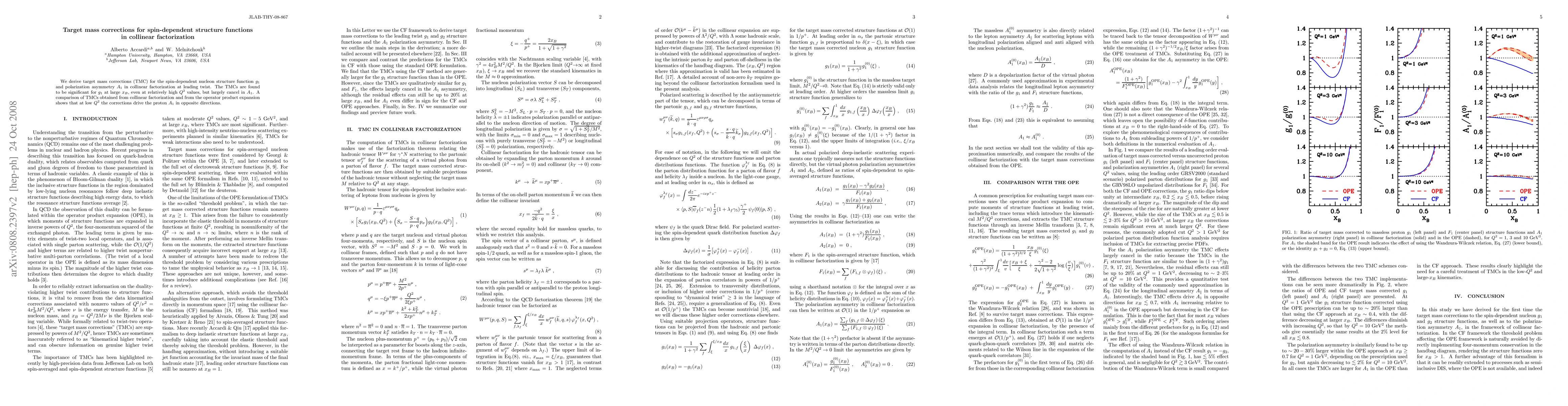 This paper derives target mass corrections for the spin-dependent nucleon structure function g1 and the polarization asymmetry A1 in collinear factorization at leading twist. The corrections are significant for g1 at large xB but largely cancel in A1, and show differing effects at low Q^2 compared to those from the operator product expansion.