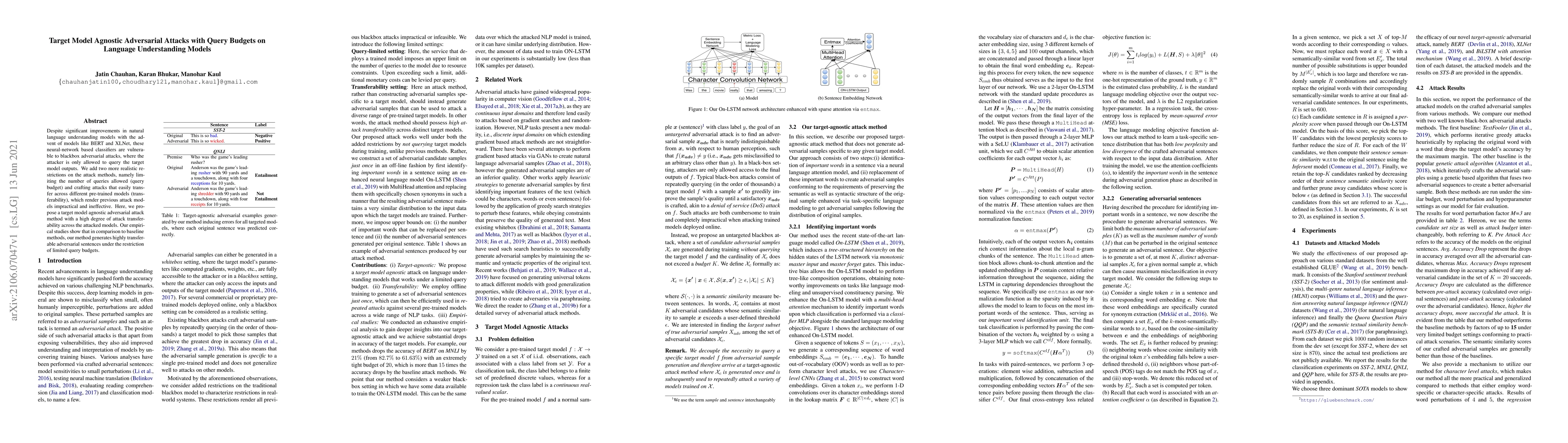 Despite significant improvements in natural language understanding models with the advent of models like BERT and XLNet, these neural-network based classifiers are vulnerable to blackbox adversarial attacks, where the attacker is only allowed to query the target model outputs. We add two more realistic restrictions on the attack methods, namely limiting the number of queries allowed (query budget) and crafting attacks that easily transfer across different pre-trained models (transferability), which render previous attack models impractical and ineffective. Here, we propose a target model agnostic adversarial attack method with a high degree of attack transferability across the attacked models. Our empirical studies show that in comparison to baseline methods, our method generates highly transferable adversarial sentences under the restriction of limited query budgets.