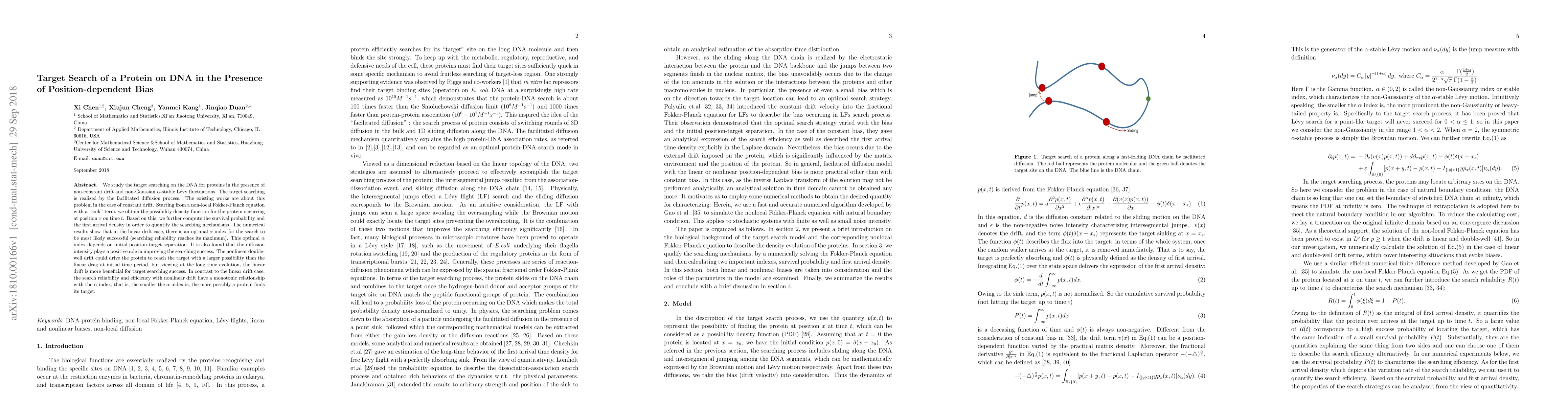 We study the target searching on the DNA for proteins in the presence of non-constant drift and non-Gaussian $\alpha$-stable L\'evy fluctuations. The target searching is realized by the facilitated diffusion process. The existing works are about this problem in the case of constant drift. Starting from a non-local Fokker-Planck equation with a "sink" term, we obtain the possibility density function for the protein occurring at position $x$ on time $t$. Based on this, we further compute the survival probability and the first arrival density in order to quantify the searching mechanisms. The numerical results show that in the linear drift case, there is an optimal $\alpha$ index for the search to be most likely successful (searching reliability reaches its maximum). This optimal $\alpha$ index depends on initial position-target separation. It is also found that the diffusion intensity plays a positive role in improving the searching success. The nonlinear double-well drift could drive the protein to reach the target with a larger possibility than the linear drag at initial time period, but viewing at the long time evolution, the linear drift is more beneficial for target searching success. In contrast to the linear drift case, the search reliability and efficiency with nonlinear drift have a monotonic relationship with the $\alpha$ index, that is, the smaller the $\alpha$ index is, the more possibly a protein finds its target.