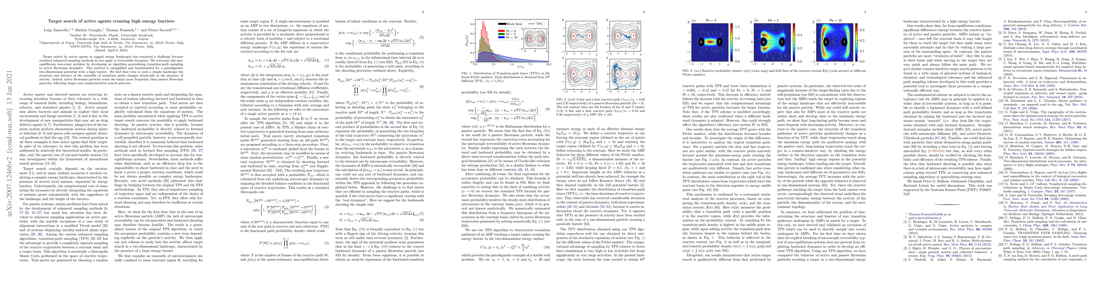 Target search by active agents in rugged energy landscapes has remained a challenge because standard enhanced sampling methods do not apply to irreversible dynamics. We overcome this non-equilibrium rare-event problem by developing an algorithm generalizing transition-path sampling to active Brownian dynamics. This method is exemplified and benchmarked for a paradigmatic two-dimensional potential with a high barrier. We find that even in such a simple landscape the structure and kinetics of the ensemble of transition paths change drastically in the presence of activity. Indeed, active Brownian particles reach the target more frequently than passive Brownian particles, following longer and counterintuitive search patterns.