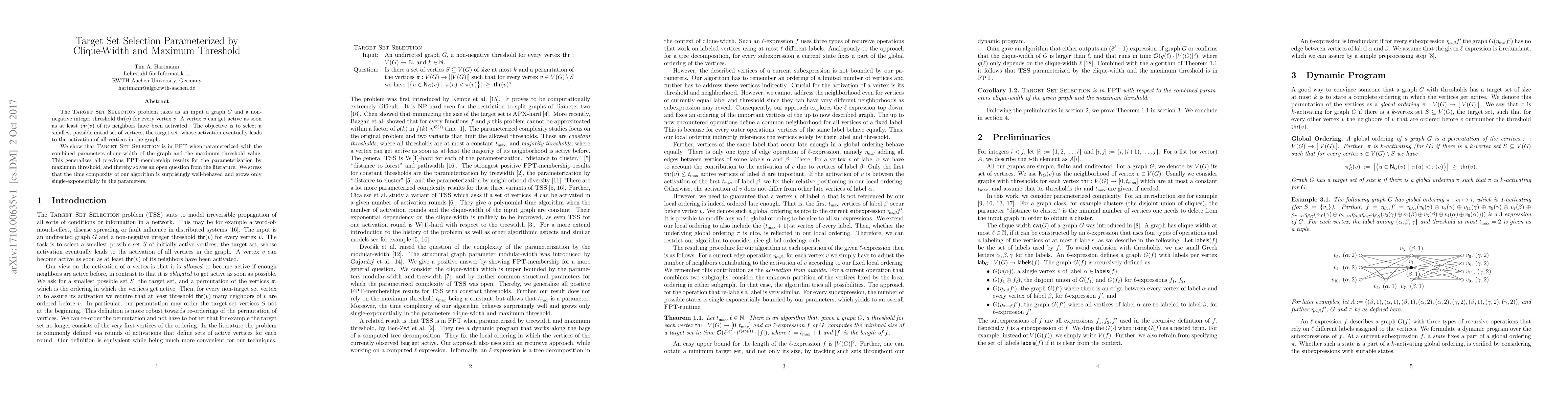 A new algorithm solves Target Set Selection problem with a smallest possible initial set of vertices that activates all other vertices in a graph within a single-exponential time complexity based on the graph's clique-width and maximum threshold value.