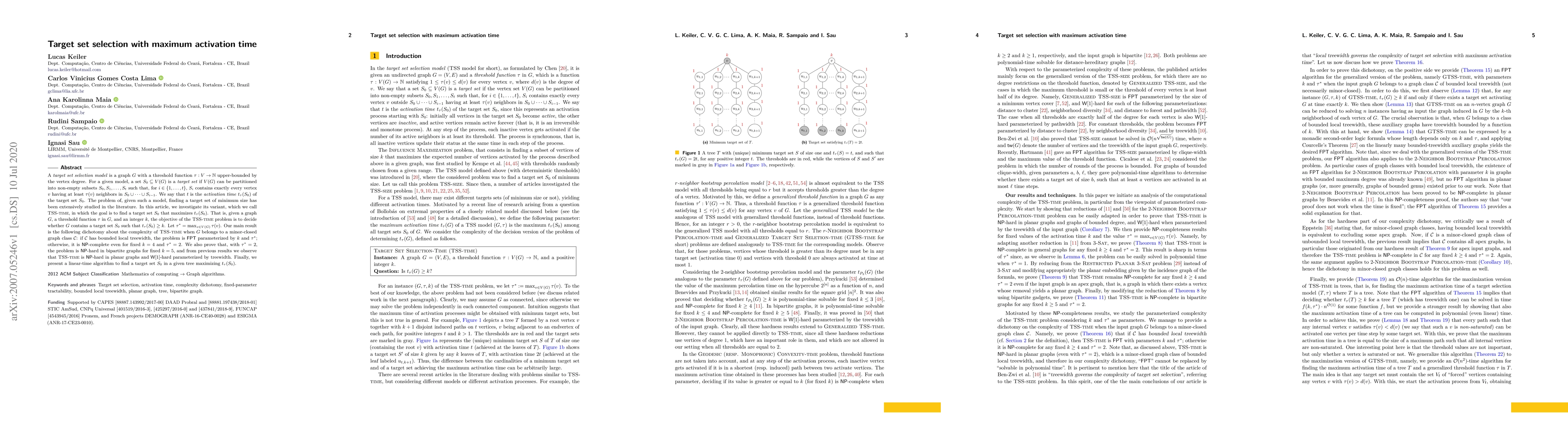 A target set selection model is a graph $G$ with a threshold function $\tau:V\to \mathbb{N}$ upper-bounded by the vertex degree. For a given model, a set $S_0\subseteq V(G)$ is a target set if $V(G)$ can be partitioned into non-empty subsets $S_0,S_1,\dotsc,S_t$ such that, for $i \in \{1, \ldots, t\}$, $S_i$ contains exactly every vertex $v$ having at least $\tau(v)$ neighbors in $S_0\cup\dots\cup S_{i-1}$. We say that $t$ is the activation time $t_{\tau}(S_0)$ of the target set $S_0$. The problem of, given such a model, finding a target set of minimum size has been extensively studied in the literature. In this article, we investigate its variant, which we call TSS-time, in which the goal is to find a target set $S_0$ that maximizes $t_{\tau}(S_0)$. That is, given a graph $G$, a threshold function $\tau$ in $G$, and an integer $k$, the objective of the TSS-time problem is to decide whether $G$ contains a target set $S_0$ such that $t_{\tau}(S_0)\geq k$. Let $\tau^* = \max_{v \in V(G)} \tau(v)$. Our main result is the following dichotomy about the complexity of TSS-time when $G$ belongs to a minor-closed graph class ${\cal C}$: if ${\cal C}$ has bounded local treewidth, the problem is FPT parameterized by $k$ and $\tau^{\star}$; otherwise, it is NP-complete even for fixed $k=4$ and $\tau^{\star}=2$. We also prove that, with $\tau^*=2$, the problem is NP-hard in bipartite graphs for fixed $k=5$, and from previous results we observe that TSS-time is NP-hard in planar graphs and W[1]-hard parameterized by treewidth. Finally, we present a linear-time algorithm to find a target set $S_0$ in a given tree maximizing $t_{\tau}(S_0)$.