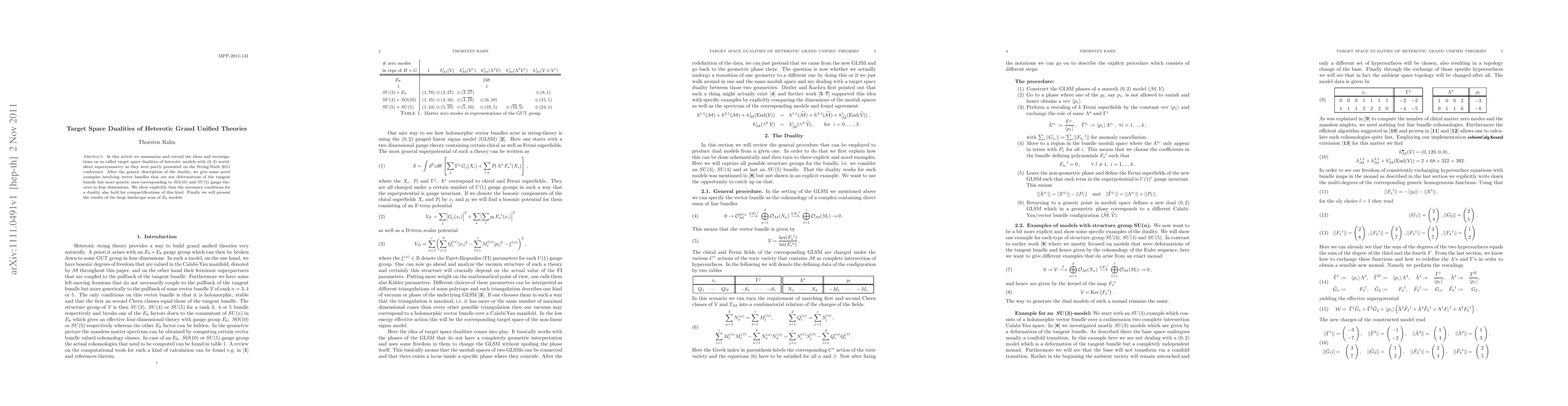 In this article we summarize and extend the ideas and investigations on so called target space dualities of heterotic models with (0,2) worldsheet supersymmetry as they were partly presented on the String-Math 2011 conference. After the generic description of the duality, we give some novel examples involving vector bundles that are not deformations of the tangent bundle but more generic ones corresponding to SO(10) and SU(5) gauge theories in four dimensions. We show explicitly that the necessary conditions for a duality also hold for compactifications of this kind. Finally we will present the results of the large landscape scan of E_6 models.