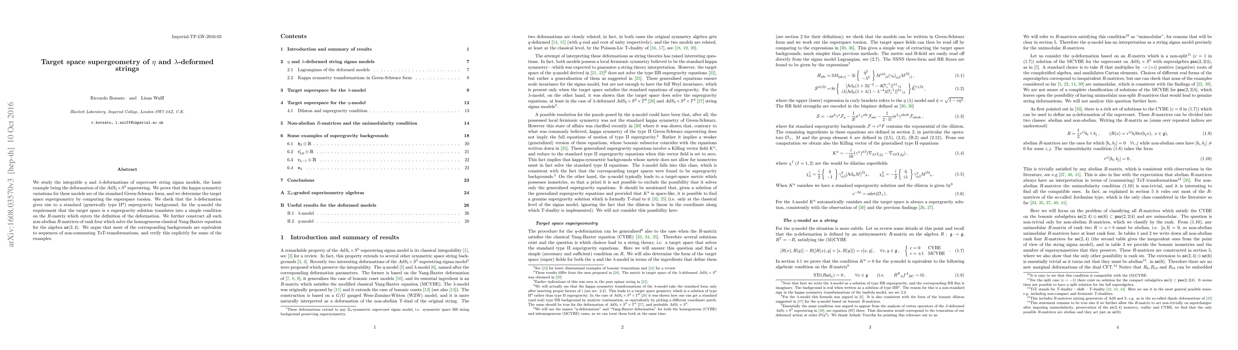 This paper investigates the target space supergeometry of deformed strings in AdS/CFT, finding that kappa symmetry variations follow standard Green-Schwarz form and non-abelian R-matrices solve a specific Yang-Baxter equation.