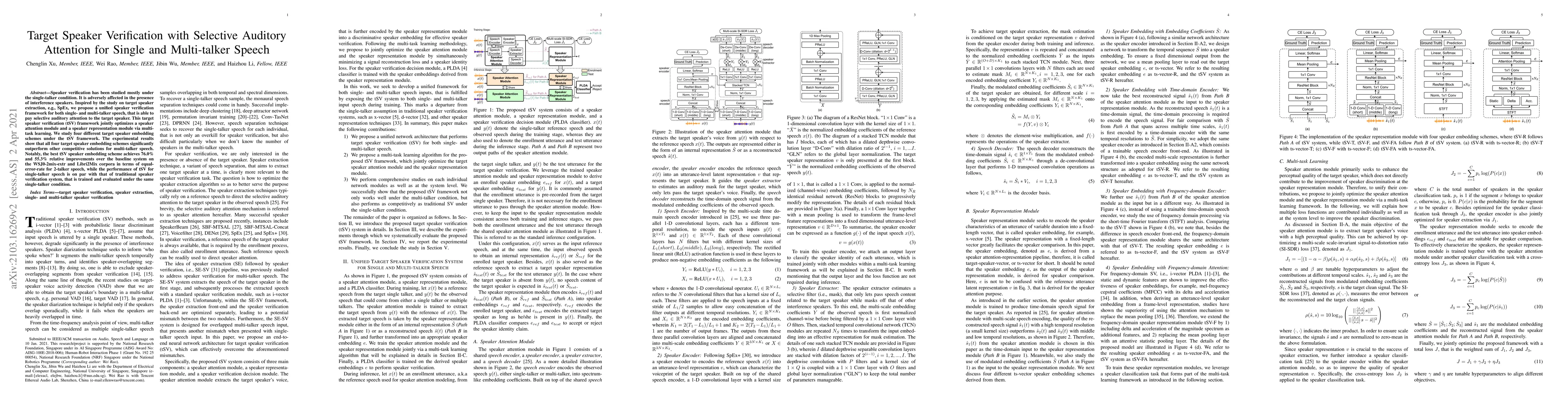 Speaker verification has been studied mostly under the single-talker condition. It is adversely affected in the presence of interference speakers. Inspired by the study on target speaker extraction, e.g., SpEx, we propose a unified speaker verification framework for both single- and multi-talker speech, that is able to pay selective auditory attention to the target speaker. This target speaker verification (tSV) framework jointly optimizes a speaker attention module and a speaker representation module via multi-task learning. We study four different target speaker embedding schemes under the tSV framework. The experimental results show that all four target speaker embedding schemes significantly outperform other competitive solutions for multi-talker speech. Notably, the best tSV speaker embedding scheme achieves 76.0% and 55.3% relative improvements over the baseline system on the WSJ0-2mix-extr and Libri2Mix corpora in terms of equal-error-rate for 2-talker speech, while the performance of tSV for single-talker speech is on par with that of traditional speaker verification system, that is trained and evaluated under the same single-talker condition.