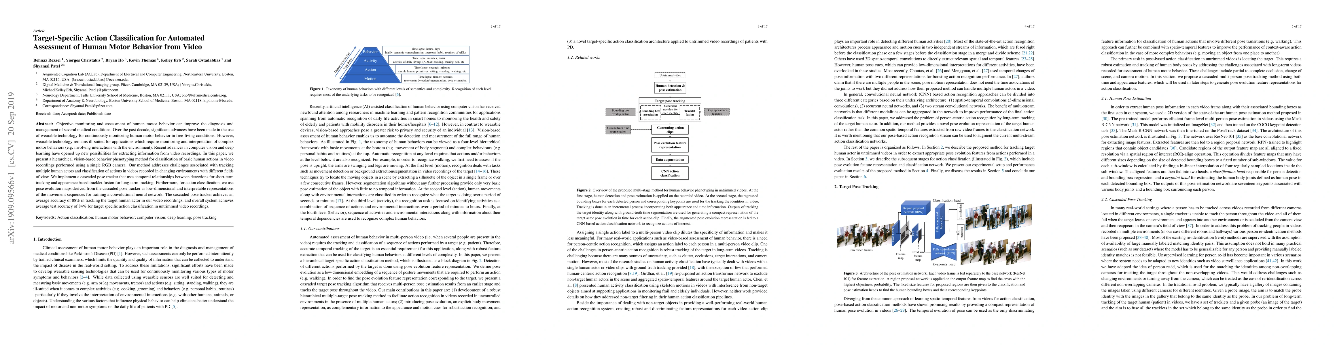 Objective monitoring and assessment of human motor behavior can improve the diagnosis and management of several medical conditions. Over the past decade, significant advances have been made in the use of wearable technology for continuously monitoring human motor behavior in free-living conditions. However, wearable technology remains ill-suited for applications which require monitoring and interpretation of complex motor behaviors (e.g. involving interactions with the environment). Recent advances in computer vision and deep learning have opened up new possibilities for extracting information from video recordings. In this paper, we present a hierarchical vision-based behavior phenotyping method for classification of basic human actions in video recordings performed using a single RGB camera. Our method addresses challenges associated with tracking multiple human actors and classification of actions in videos recorded in changing environments with different fields of view. We implement a cascaded pose tracker that uses temporal relationships between detections for short-term tracking and appearance-based tracklet fusion for long-term tracking. Furthermore, for action classification, we use pose evolution maps derived from the cascaded pose tracker as low-dimensional and interpretable representations of the movement sequences for training a convolutional neural network. The cascaded pose tracker achieves an average accuracy of 88\% in tracking the target human actor in our video recordings, and overall system achieves average test accuracy of 84\% for target-specific action classification in untrimmed video recordings.