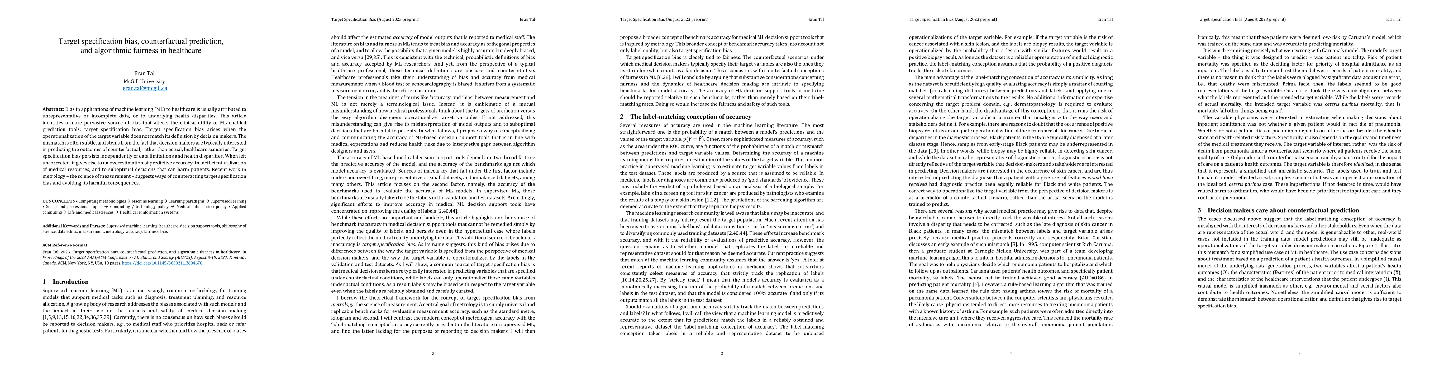 This paper identifies target specification bias as a pervasive issue in machine learning applications for healthcare, arising from mismatches between the operationalized target variable and decision makers' interests in counterfactual outcomes. It argues that this bias, independent of data limitations, leads to overestimation of predictive accuracy, inefficient resource use, and harmful patient decisions, and proposes metrology-based solutions to mitigate its effects.