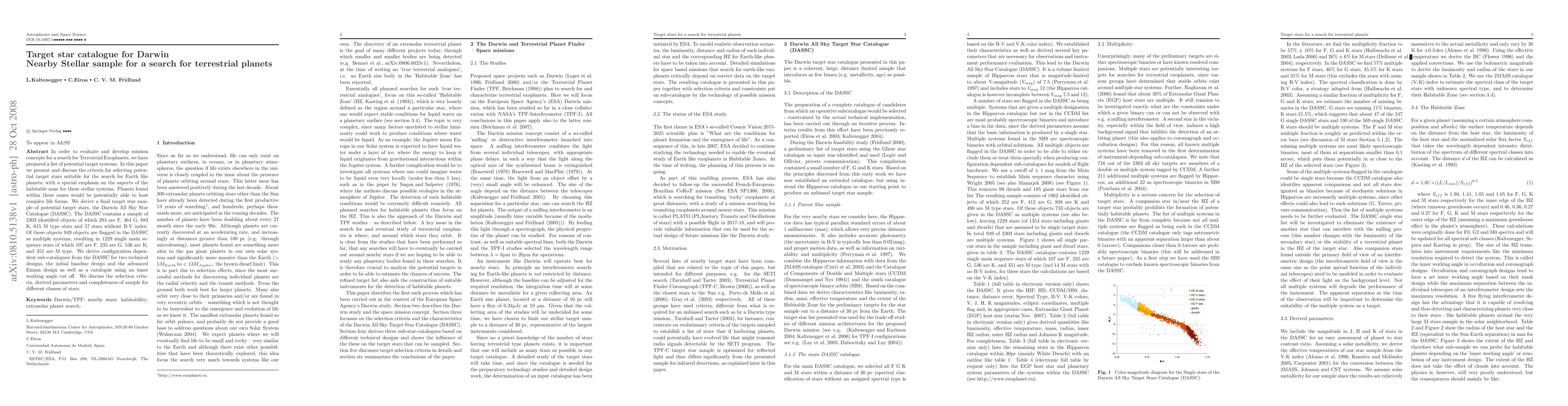 This paper presents a comprehensive catalog of potential target stars for the Darwin mission, focusing on finding Earth-like planets within their habitable zones. The Darwin All Sky Star Catalog (DASSC) includes 2303 stars, with 1229 single main sequence stars, categorized by spectral type, and subcatalogs tailored for different technical designs.