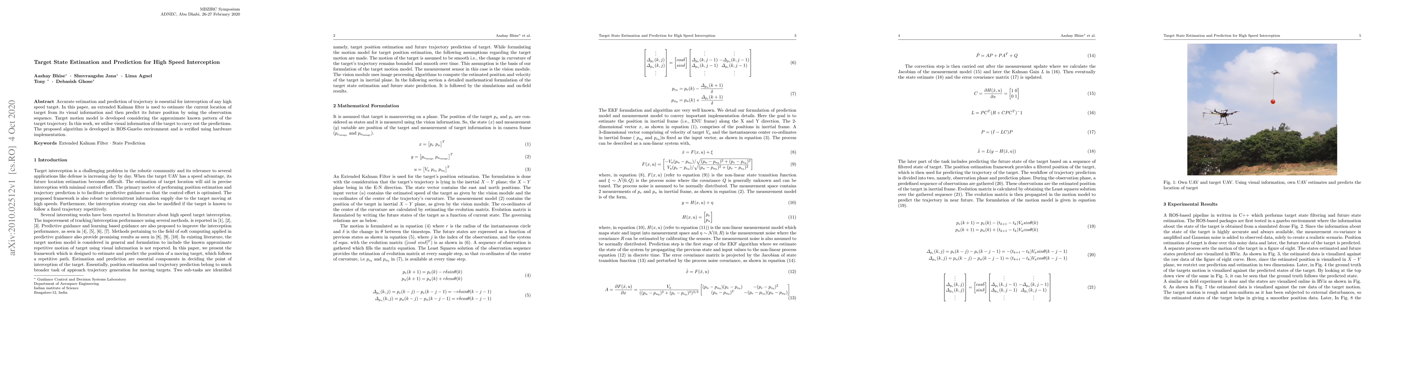 This paper proposes an extended Kalman filter for estimating and predicting the trajectory of high-speed targets using visual information. The algorithm is developed in ROS-Gazebo and validated through hardware implementation.