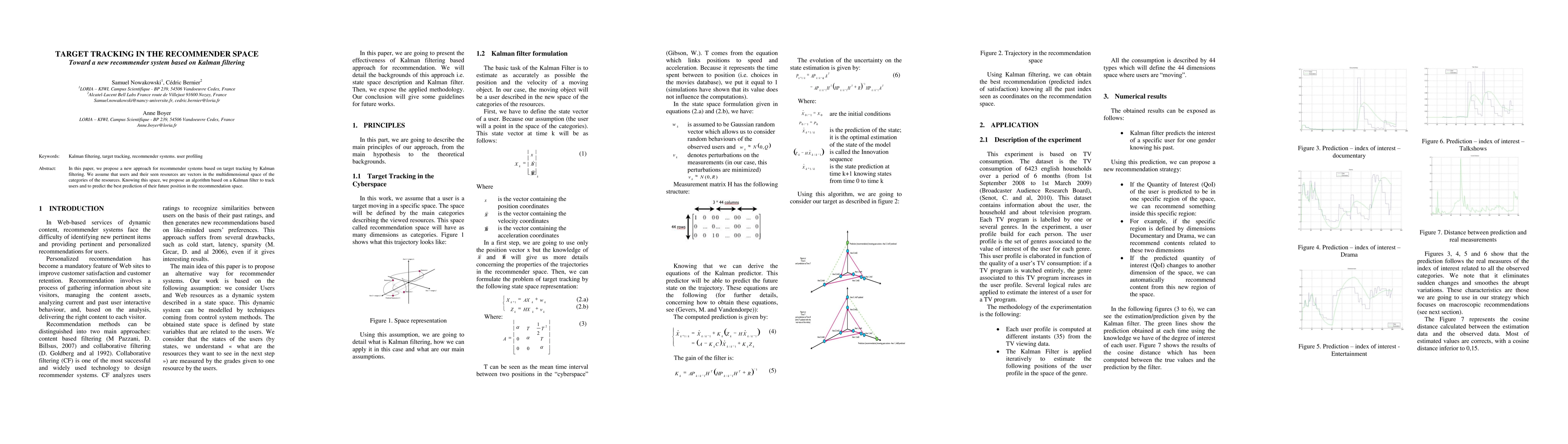 In this paper, we propose a new approach for recommender systems based on target tracking by Kalman filtering. We assume that users and their seen resources are vectors in the multidimensional space of the categories of the resources. Knowing this space, we propose an algorithm based on a Kalman filter to track users and to predict the best prediction of their future position in the recommendation space.