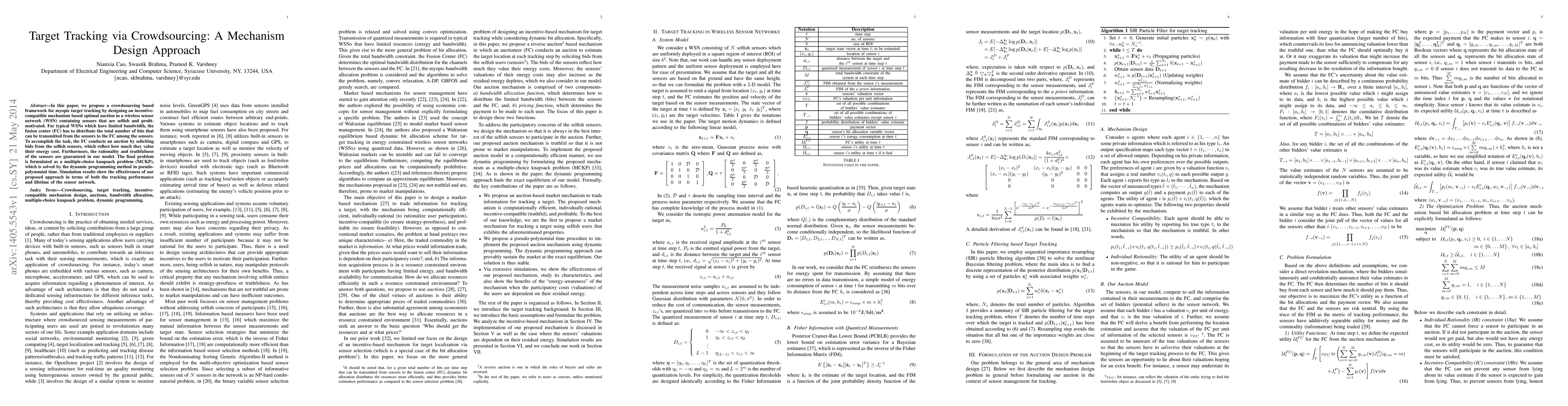 In this paper, we propose a crowdsourcing based framework for myopic target tracking by designing an incentive-compatible mechanism based optimal auction in a wireless sensor network (WSN) containing sensors that are selfish and profit-motivated. For typical WSNs which have limited bandwidth, the fusion center (FC) has to distribute the total number of bits that can be transmitted from the sensors to the FC among the sensors. To accomplish the task, the FC conducts an auction by soliciting bids from the selfish sensors, which reflect how much they value their energy cost. Furthermore, the rationality and truthfulness of the sensors are guaranteed in our model. The final problem is formulated as a multiple-choice knapsack problem (MCKP), which is solved by the dynamic programming method in pseudo-polynomial time. Simulation results show the effectiveness of our proposed approach in terms of both the tracking performance and lifetime of the sensor network.