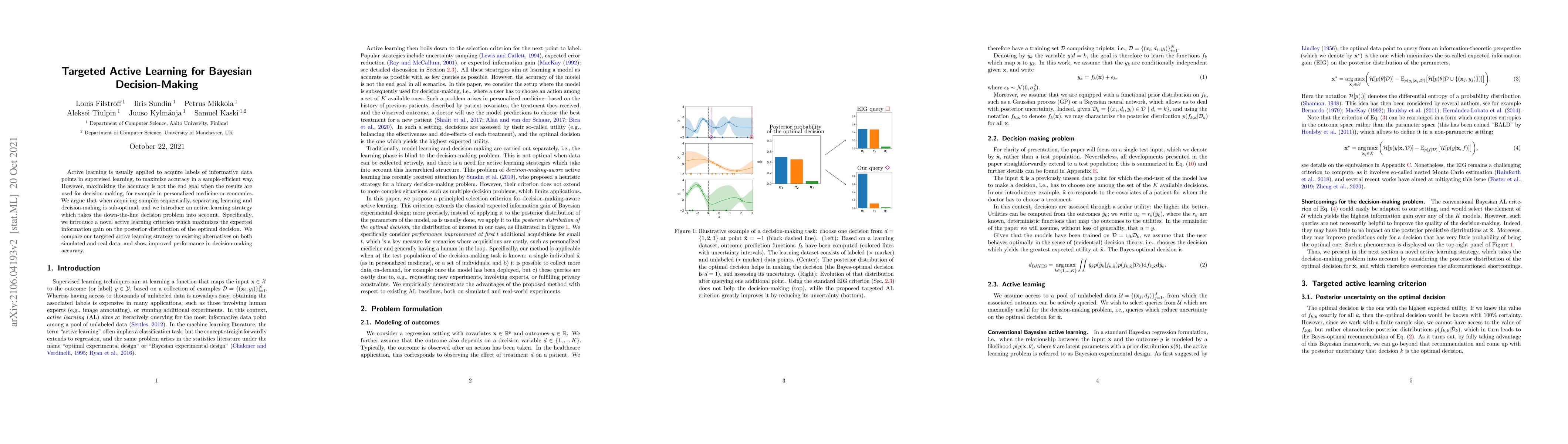 This paper proposes a targeted active learning strategy that integrates decision-making into the learning process, aiming to maximize information gain for optimal decisions rather than just accuracy. The new method shows improved decision-making performance compared to traditional methods on both simulated and real datasets.