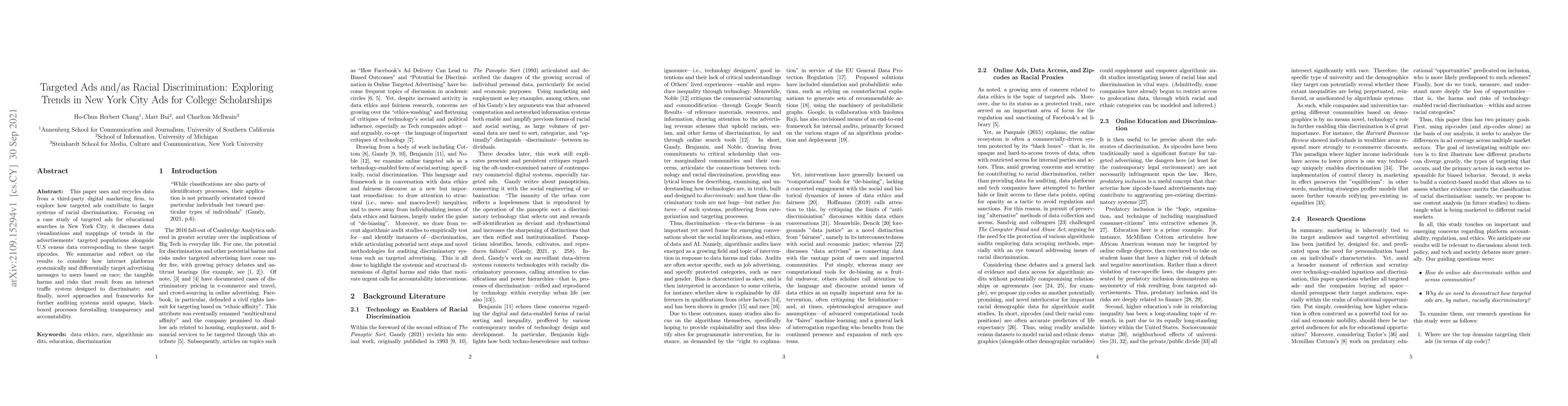 This paper examines targeted ads for college scholarships in New York City, revealing how these ads contribute to racial discrimination through data visualizations and census mappings. It highlights the systemic targeting of advertising based on race and discusses potential harms, alongside suggestions for more transparent auditing frameworks.