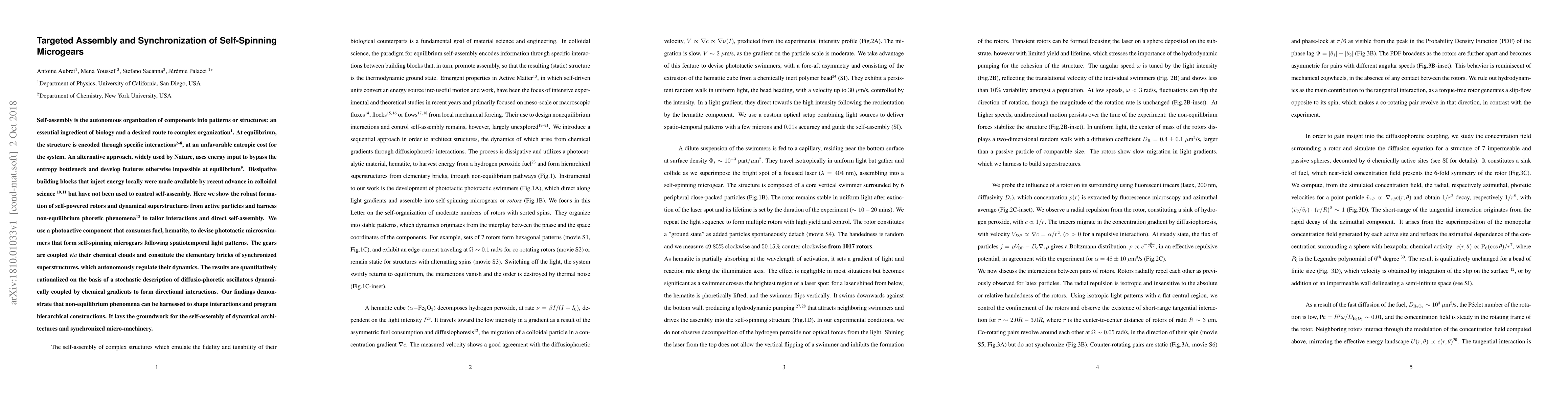 This paper demonstrates the creation of self-spinning microgears using photoactive microswimmers powered by hematite, which form synchronized superstructures via non-equilibrium phoretic interactions. The study provides a stochastic model to explain the dynamic coupling and interaction of these microgears, showcasing a novel approach to self-assembly in non-equilibrium systems.