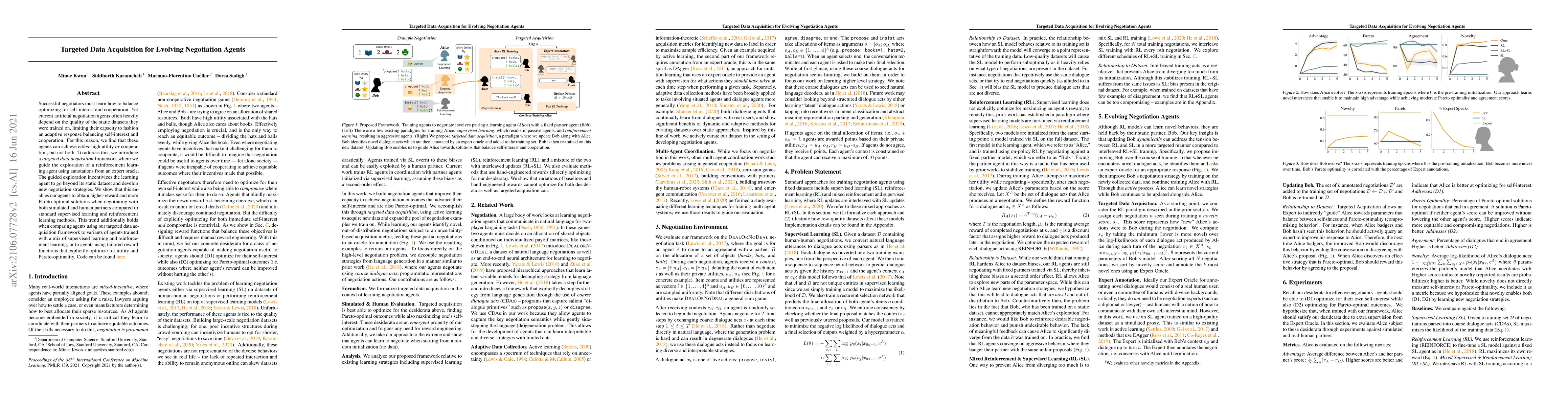This paper proposes a targeted data acquisition framework to enhance negotiation agents' ability to balance self-interest and cooperation. By guiding reinforcement learning with expert annotations, the framework enables agents to develop adaptive negotiation strategies, achieving higher rewards and more Pareto-optimal solutions compared to standard learning methods.