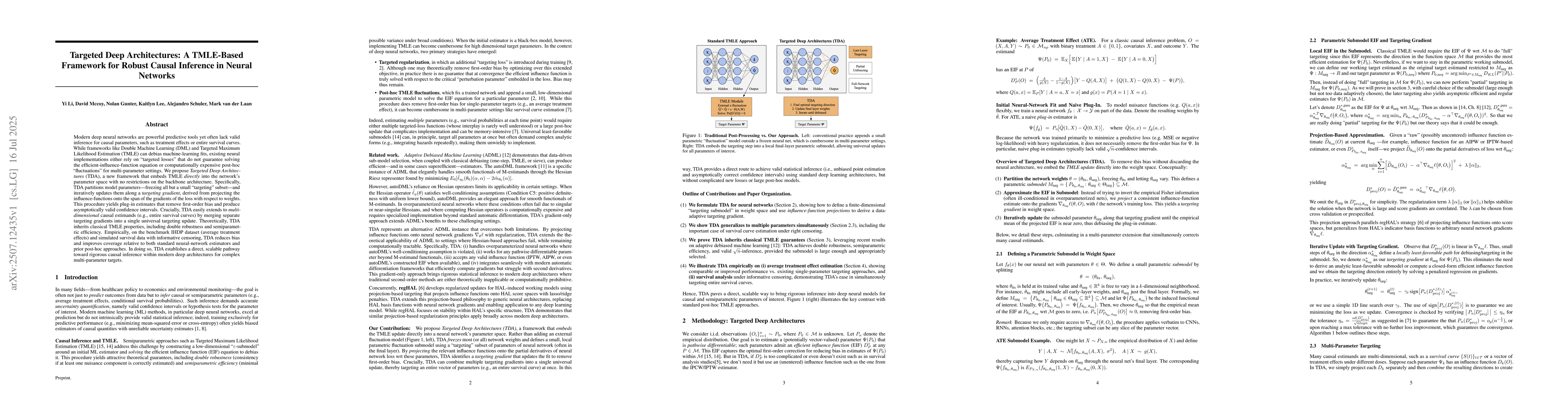 Modern deep neural networks are powerful predictive tools yet often lack valid inference for causal parameters, such as treatment effects or entire survival curves. While frameworks like Double Machine Learning (DML) and Targeted Maximum Likelihood Estimation (TMLE) can debias machine-learning fits, existing neural implementations either rely on "targeted losses" that do not guarantee solving the efficient influence function equation or computationally expensive post-hoc "fluctuations" for multi-parameter settings. We propose Targeted Deep Architectures (TDA), a new framework that embeds TMLE directly into the network's parameter space with no restrictions on the backbone architecture. Specifically, TDA partitions model parameters - freezing all but a small "targeting" subset - and iteratively updates them along a targeting gradient, derived from projecting the influence functions onto the span of the gradients of the loss with respect to weights. This procedure yields plug-in estimates that remove first-order bias and produce asymptotically valid confidence intervals. Crucially, TDA easily extends to multi-dimensional causal estimands (e.g., entire survival curves) by merging separate targeting gradients into a single universal targeting update. Theoretically, TDA inherits classical TMLE properties, including double robustness and semiparametric efficiency. Empirically, on the benchmark IHDP dataset (average treatment effects) and simulated survival data with informative censoring, TDA reduces bias and improves coverage relative to both standard neural-network estimators and prior post-hoc approaches. In doing so, TDA establishes a direct, scalable pathway toward rigorous causal inference within modern deep architectures for complex multi-parameter targets.